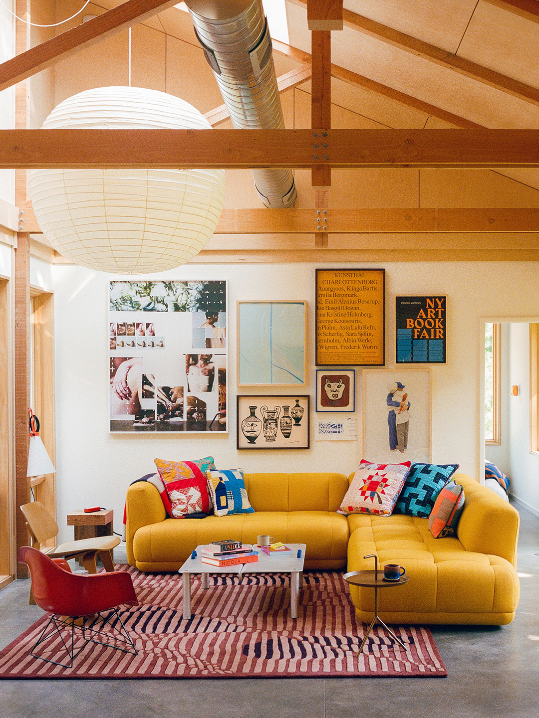 Cut to this past fall, when the duo, along with their friend Matt Moffitt of Studio Bardo, debuted Parcel Friends—a seven-acre plot with two Scandinavian-inspired cabins built from the ground up in Michigan’s Leelanau County, a maple-tree-filled peninsula on Lake Michigan. Outside, cedar exteriors blend into the natural surroundings, while inside, sunny Hay sofas, vibrant Dansk cookware, and Danish posters bring the Scandi-bright energy.