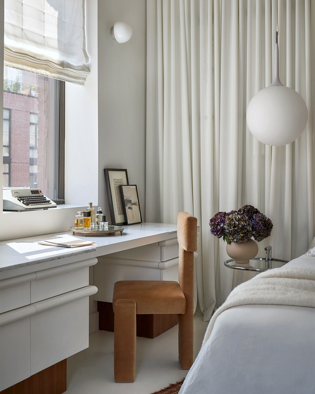 Two of Wright’s most prized possessions, a Nuristani mirror and a Qashqai rug (both purchased in Afghanistan), have pride of place in her bedroom, but so does her printer. Wright works from home four days a week, so carving out room for a desk was essential. Sinclair designed one that spans the entire wall, leaving plenty of room for a makeup station, too. “It only made sense to put it along the window so she can look outside,” says the designer. Although the view inside isn’t so bad either.