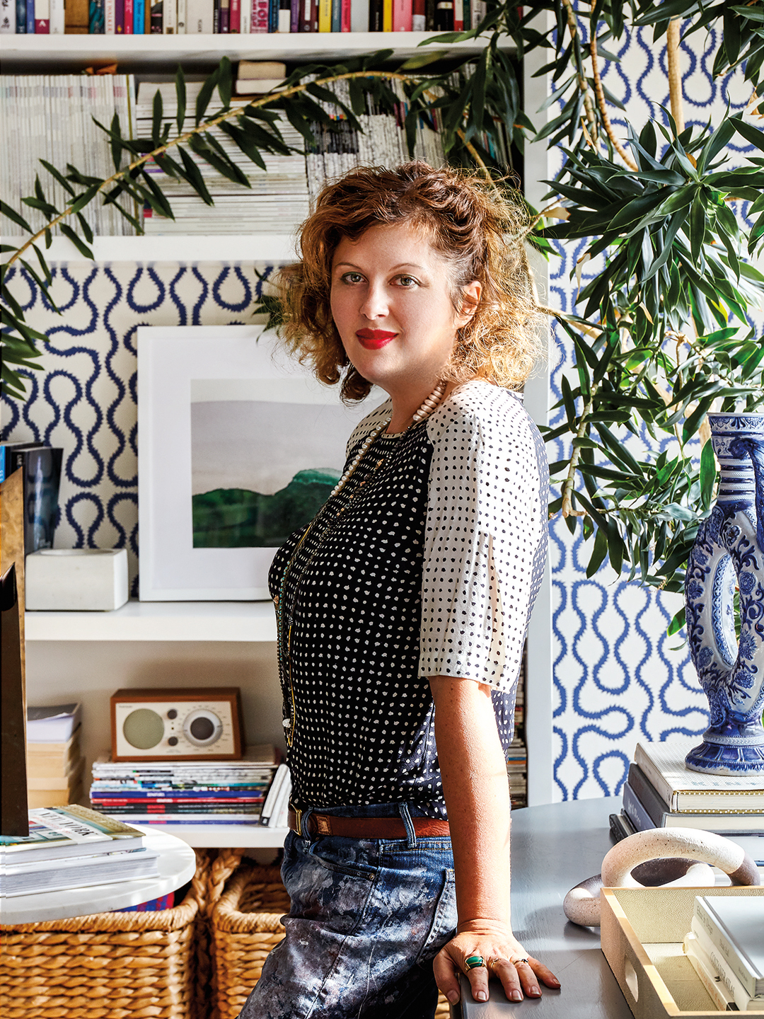 Naiman approaches her bookshelves as stackable still lifes (and a way to keep items out of reach of her little ones), using each square of the shelving system as a frame. The shelves earmarked to hold decorative accessories are lined with a graphic wallpaper, while the shelves reserved for books are left blank to avoid an overly crowded feel. The loose checkerboard effect allows the eye to move freely from one composition to the next. “It’s an easy way for renters to add depth to a wall,” she points out.