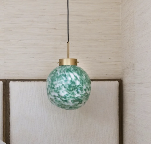 When Brook created the coffee table, he used the same methods and materials as he did for the banquette. He started with a flexible wood base to achieve the wavy form and then plastered over the wood with microcement. Next, the surface was painted with a limewash and varnished to achieve a smooth texture. Many of the Murano glass fixtures seen throughout the home, however, are all Gemma—she sells the speckled handmade pieces on her site. “I was quite creative. Gemma was quite creative. And then I had a partner who could make and interpret both of our designs,” says Orlagh.