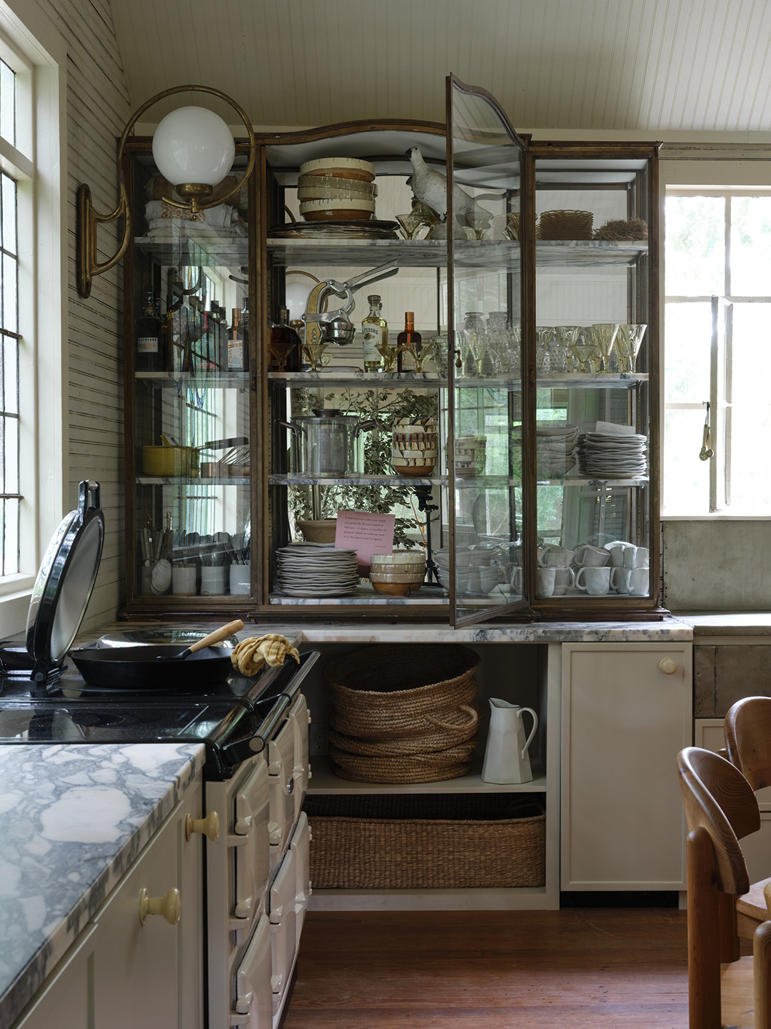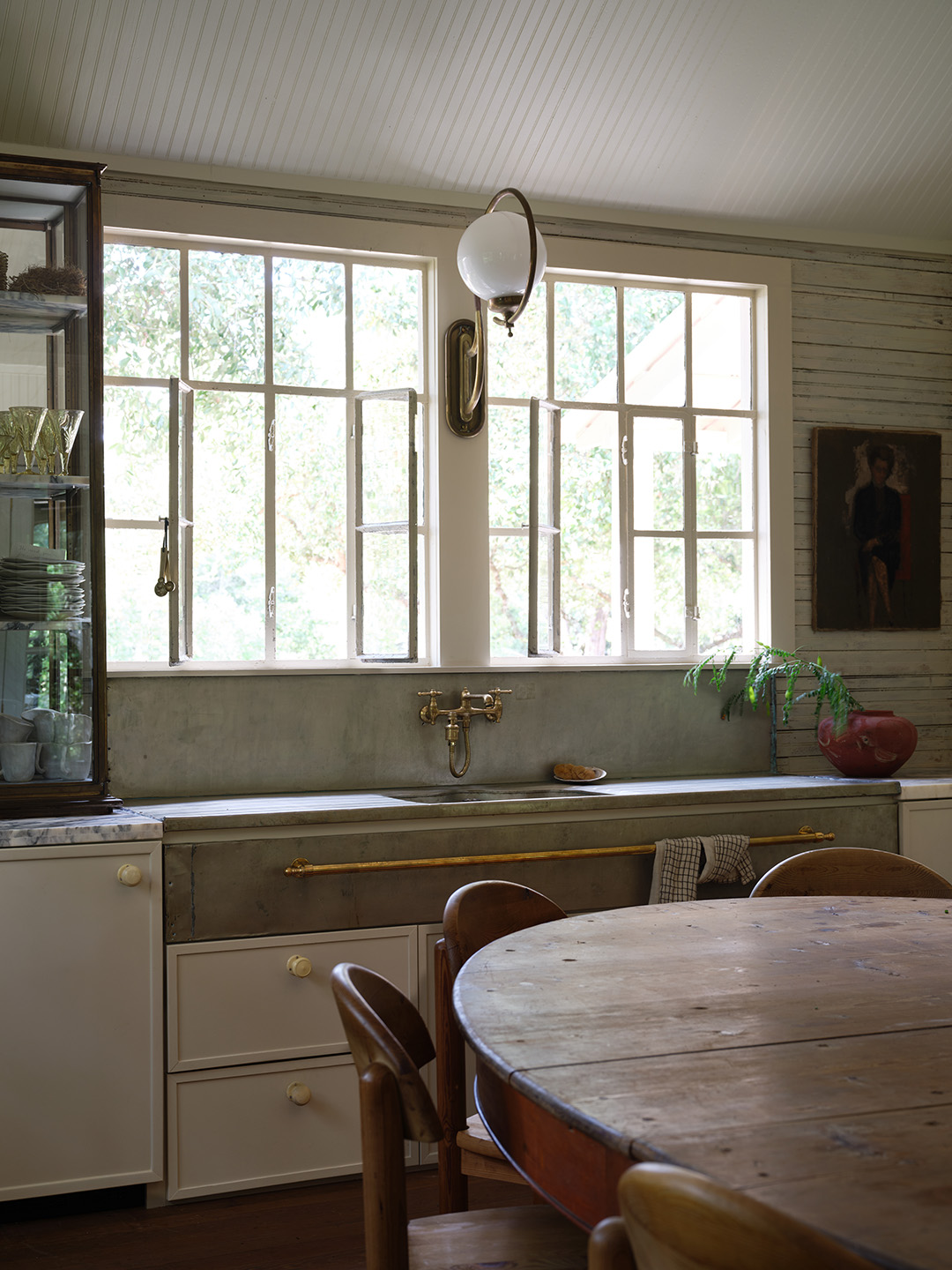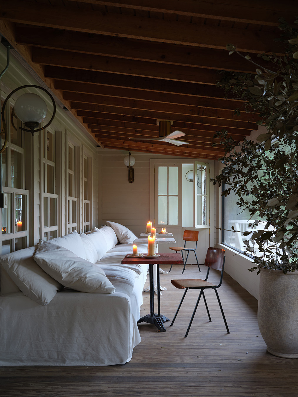 Ford: Anyone else on the planet would think that table was too big for the kitchen, but we loved it, and we wanted to fill that space. It’s crazy how when you put big furniture into a room, the space feels bigger instead of smaller. Sconces, Leftovers Antiques; Vintage Table, Architectural Artifacts; Vintage Chairs, @jerseyjunker.Ford: We had a debate—Grace likes color, and we were trying to figure out how to make the stained-glass window not so pastel. I tried some things that did not work (like gold-leafing it, which was messy and pointless). At the end of the day, the window is gorgeous as is. Mitchell: I love that marble: It’s Calacatta Rosa. I actually happened to find a broken piece that the stone yard wasn’t going to sell. They were like, “If you take it, you have to move it.” So we bought it and got someone to truck it out to Round Top. Mitchell: We had seen this cabinet at Round Top and thought that it was on hold for us. When we went back, it was sold. I could not move on. The vendor told me who had bought it (it was another vendor), so we threw in some extra money to get it back. It was worth it. Vintage Cabinet, originally from @jerseyjunker; Range, AGA; Counters, Aria Stone Gallery.Ford: The sink is German silver from our friend Jill at LooLoo Design. She’s got incredible sinks and tubs. We had our contractor, Sam, add drawers below it. Sink, LooLoo Design.Ford: We did custom extra-long Ever sofas from my Crate & Barrel collection everywhere. If you put furniture wall to wall in these little rooms, it makes them feel bigger. The painting is by Alexandra Valenti out of Austin. Grace pointed out that there are two ladies on there with matching outfits—like us! Vintage Lamp, @prizekc; Sofas, Crate & Barrel.Ford: The family room was really strange, because you just walk into it from the front door. We couldn’t wait to get that coffee table in place, because that was our final pièce de résistance of making sense of this layout. Table, Eneby Home.Ford: There were 30 of these sconces at a shop in town. We initially only wanted four, but the vendor said he was only selling them as a set. We left, did the math, and convinced each other to buy them all. We put them everywhere. Vintage Vanity, Leftovers Antiques.Mitchell: The shower was fully tiled with subway tile and black grout. We plastered over it, which ended up being great because we didn’t have to demo and make a big mess. Ford: We found the massive steel shower door from our friend who owns Jardin de France, where I’ll be doing a book-signing party on October 14. Shower Door, Jardin de France; Showerhead System, Brassna.Mitchell: We had to put extra support under the house to make it a lot stronger to hold the stone tub. I think it took six guys to get it in the room; it was a little harrowing. Tub, Architectural Artifacts; Towel, Baina; Tub Filler, Brassna; Doors, Antiques and Vintage Texas.Ford: You can’t see any neighbors from the bathroom. It’s all greenery behind you. Ford: In this bedroom, we put Dutch doors going out to the screened-in porch. You can sleep with them wide open on beautiful days. Rachel Ashwell Bed Frame, Shabby Chic; Bedding, Matteo; Vintage Side Table, Architectural Artifacts. Ford: We mimicked the family room on the back porch by filling it with Ever sofas. Sofas, Crate & Barrel.Ford: The record nook is across from the wall where the art is in the living room. We love making good use of a nook, and in Texas, everything is about music. Lamp LooLoo Design.Ford: There was so much original beadboard throughout the house, so we saved it wherever we could. The tadelakt walls behind the tub in this bathroom are waterproof. Tub, LooLoo Design; Showerhead, Brassna.Ford: There was beadboard that was new, and then there was the old wood beadboard—they were reading very differently when we would put all the white paint samples on them. We ended up doing Joa’s White on the original beadboard and Lime White on the new walls, but they translated to the same color. Ford: We must have carried those marble tables on the left into every room of the house—we certainly didn’t buy them for the front porch! But being able to be out there and sit and have your coffee or, you know, do your work if you must—this is the spot to do it. Exterior Paint, Oxford Stone by Farrow & Ball.Ford: Our friend delivered that firepit on a tractor the day we left, so we haven’t sat around there yet. But you better believe we’re excited to do that.