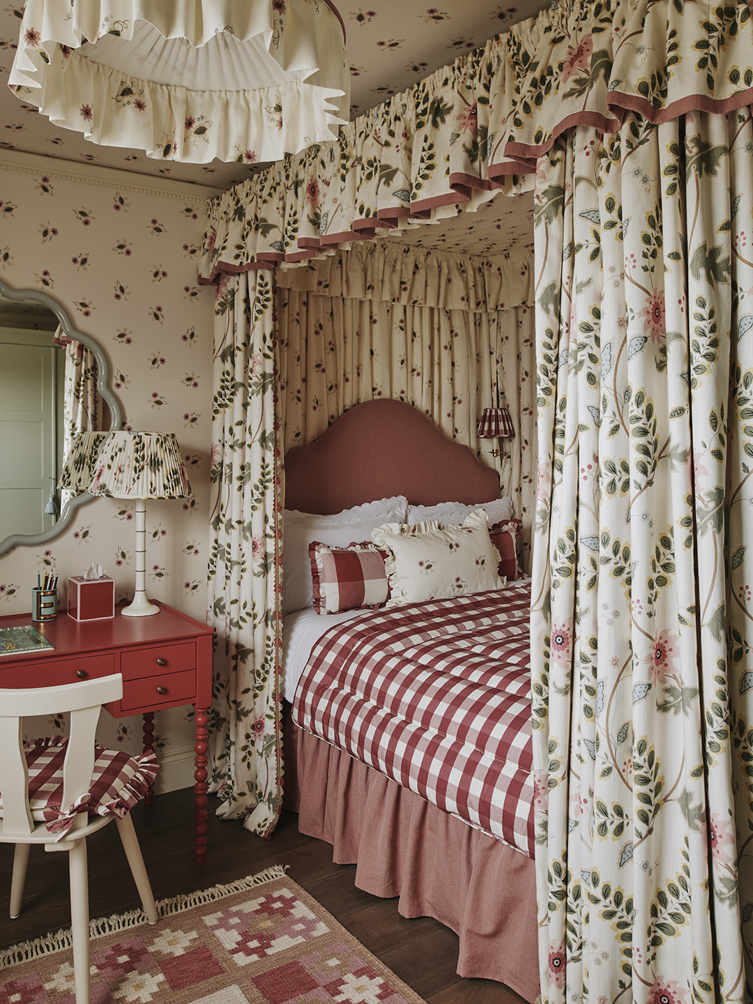 A sort of “masculine femininity” could be considered a Salvesen Graham signature, where floral fabrics are offset by sludgy or muted colorways, skirted furniture is counterbalanced by more tailored pieces and pretty details are used alongside more structured, tailored lines. The drawing room gathered fabrics sit against a tobacco backdrop, in the hallway geometrics meet florals, and even in the kitchen, chintz sits alongside joinery. In the main bedroom, a fully dressed four-poster bed and pleated lampshades are “oomphed up with rich inky colors like aubergine and dark blue,” as Mary puts it. The contrast really is the distinctive element that Mary and Nicole bring to a project.