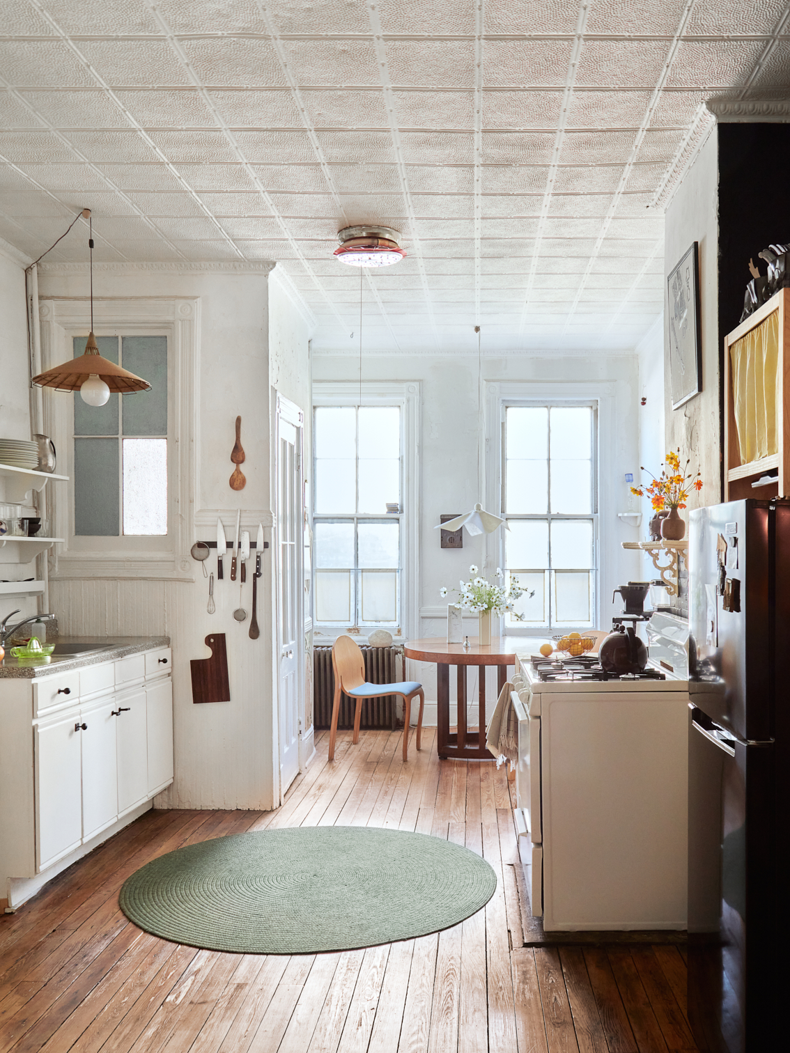 After several years of accepting the inevitable design restraints of life with roommates, Queens, New York–based furniture and jewelry designer Sarah Burns was longing for a blank slate to make her own. So when she got a tip on a not-yet-listed unit in Ridgewood, she was willing to snatch up the “filthy” railroad apartment under one condition: “The place was an absolute dump,” she shares. “But I knew that if I could peel back the vinyl and find solid wood, I’d have a good place to start.” Although her rent would double living there, it was still the most affordable thing she could find. And sure enough, under a layer of shabby brown flooring, she found the potential she was looking for.