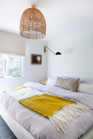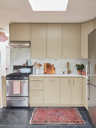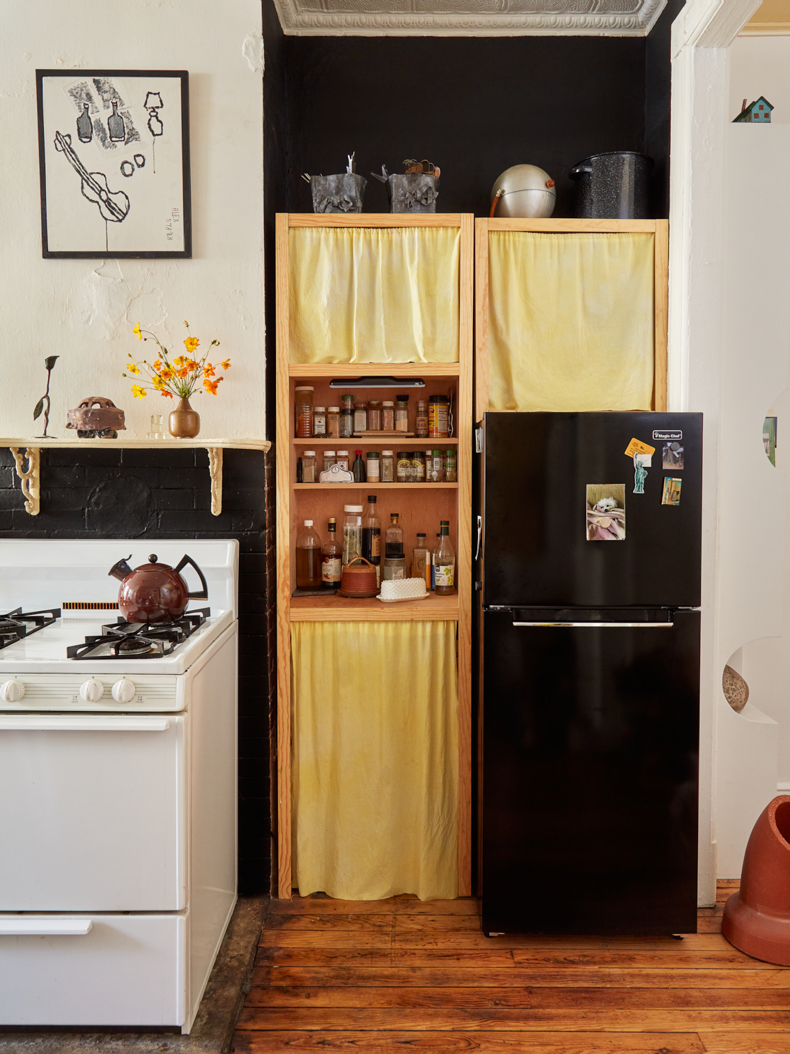 Thrilled as Burns was with her discovery, she also found the surface underneath had been painted burgundy (not to mention covered in glue residue), plus the kitchen cabinet situation was nothing less than claustrophobic and there were smoke stains yellowing the walls. “It needed a lot of TLC, but I wanted a challenge,” she says. Now the only yellow in sight is on the cheerful curtains covering the front door and cupboards framing the fridge.