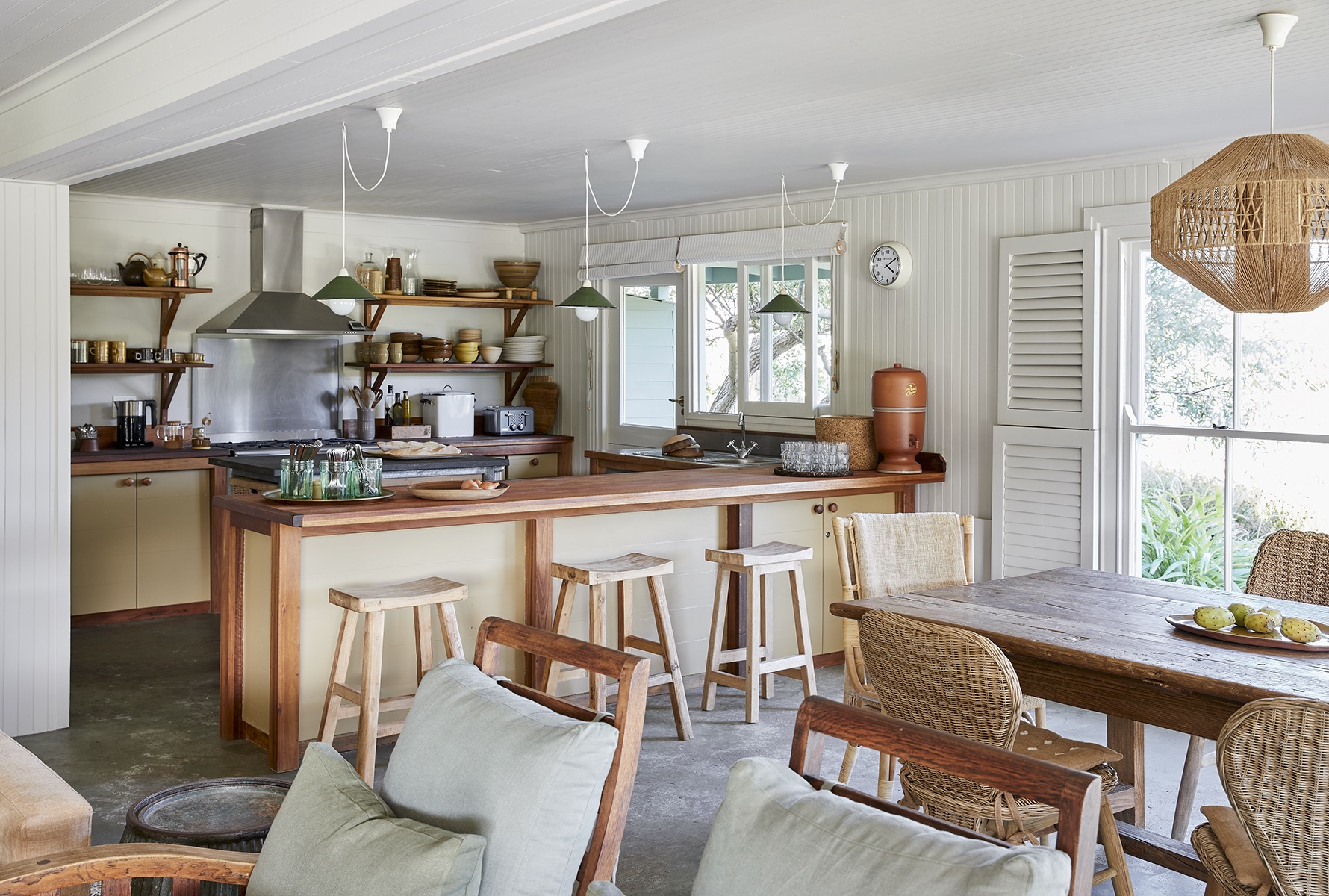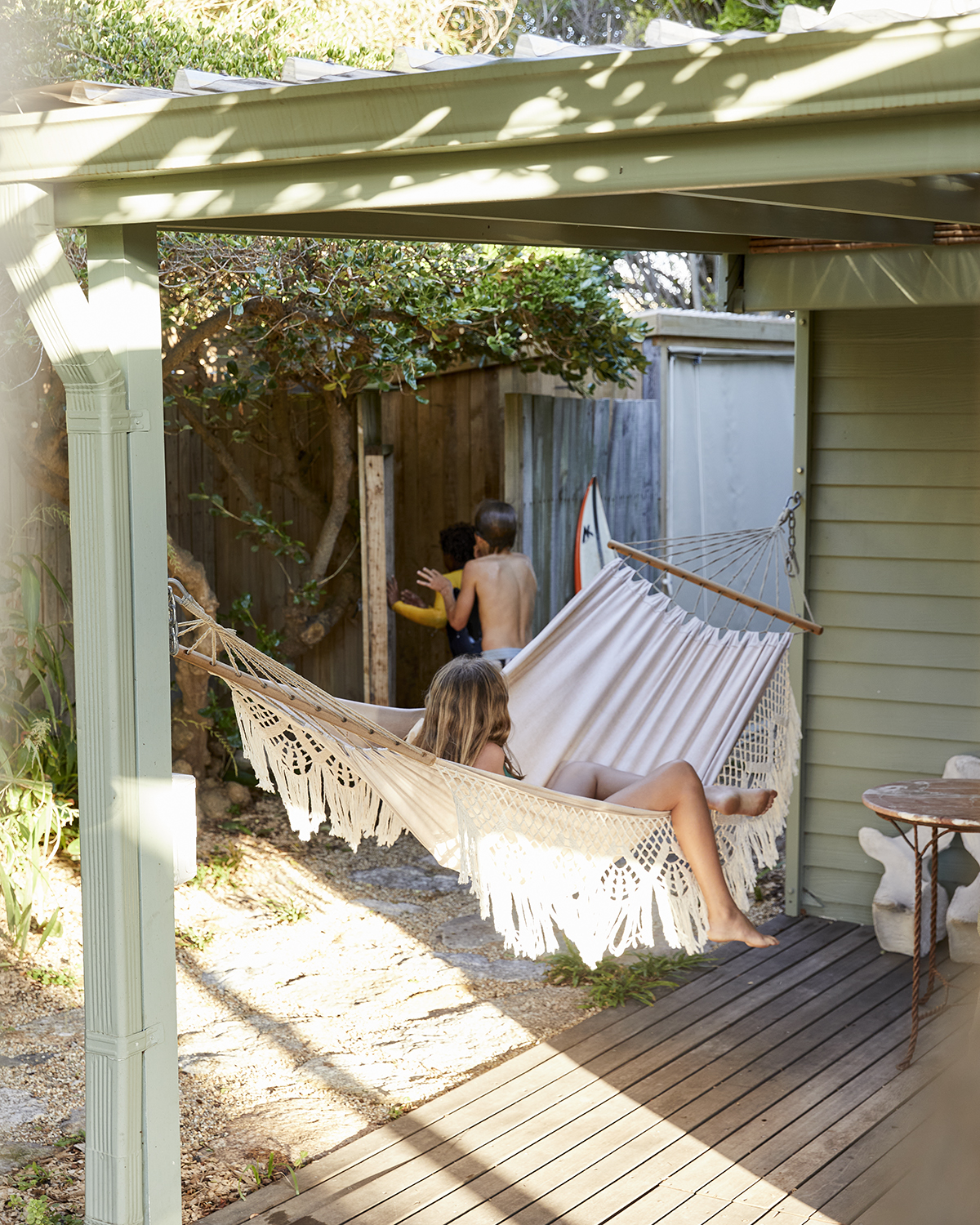 “We all eat together and move between the outside table and indoors,” says one of the homeowners. “Kids come back from a surf and move between the hot tub, the swimming pool, and playing soccer on the lawn. It’s all very relaxed.” In fact, it’s been that level of relaxed from the very beginning. When the family bought the property five years ago, they inherited it—and almost all of the furniture inside—from interior designer Boyd Ferguson and his sister, Geordi de Sousa Costa. “Buy for lifestyle,” is the current owners’ house-hunting motto.