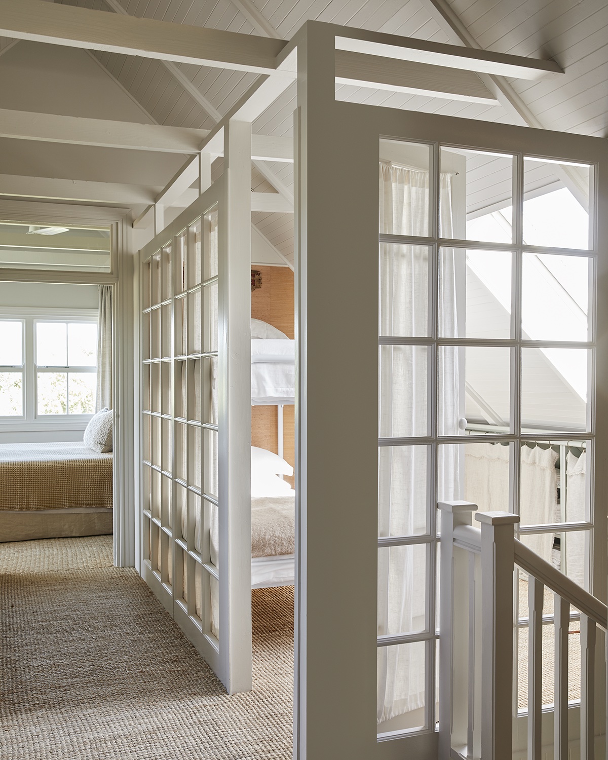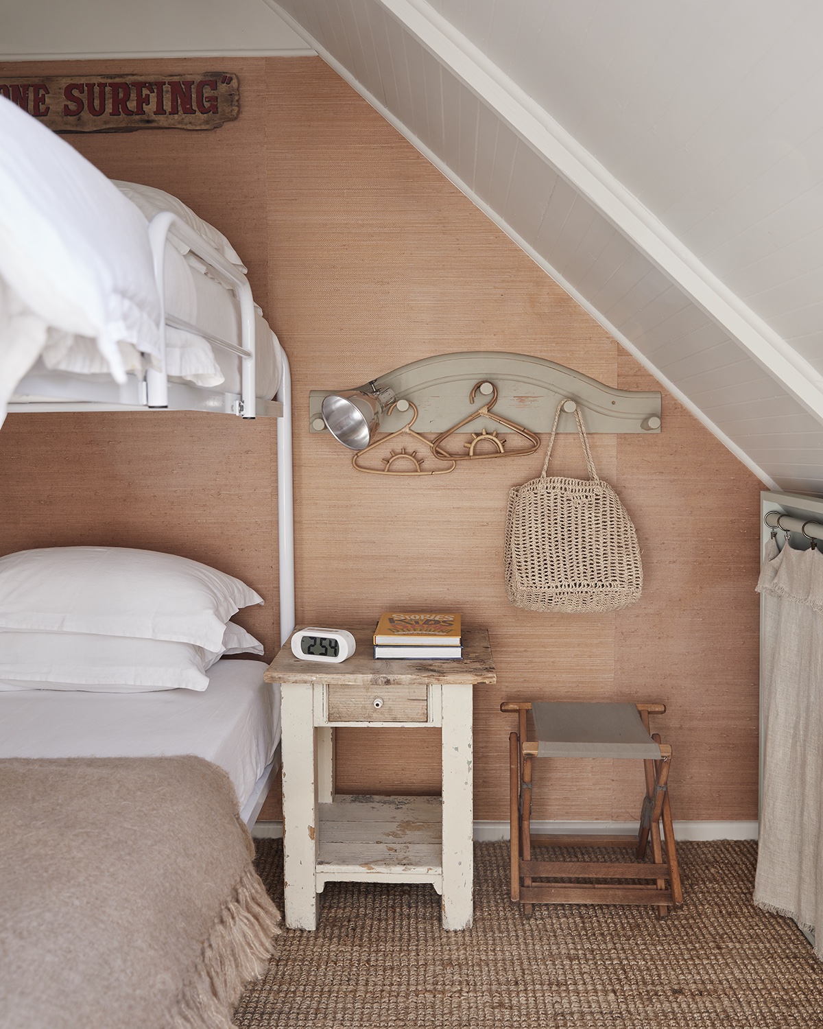 The bunk room upstairs is for the owners’ youngest son and his friends, and was designed to re-create the feeling of camping. However, the bedroom offers more storage than a tent, thanks to a cubby underneath the window that can be cleverly hidden with a curtain. “The intention in this house is to not take anything too seriously,” say the owners. Mission accomplished.