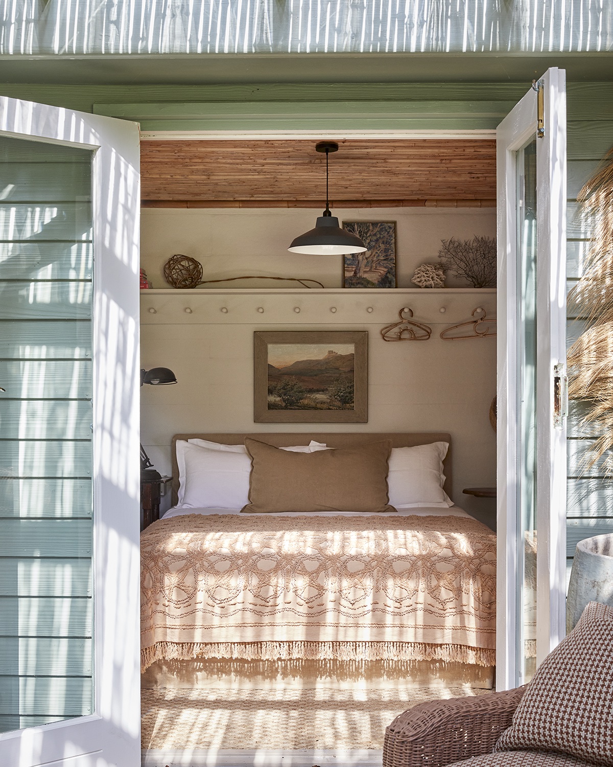 Ultimately, it was Debra Parkington who made the final call. The homeowners, who had been going to the weekend retreat for a few years at that point, tasked Parkington with tweaking some of their furniture and reconfiguring the already well-designed space to better suit their family’s needs. Parkington landed on a light moss shade that is partly inspired by the original stained concrete floors that run throughout the four-bedroom, two-bathroom home. With this decision, Parkington truly made the wood house one with its surroundings. The wraparound veranda offers views of the wetlands, milkwood forests, hiking trails, and the family’s blossoming garden. It’s the quintessential beach house where long lunches and even longer afternoon naps are a regular occurrence.
