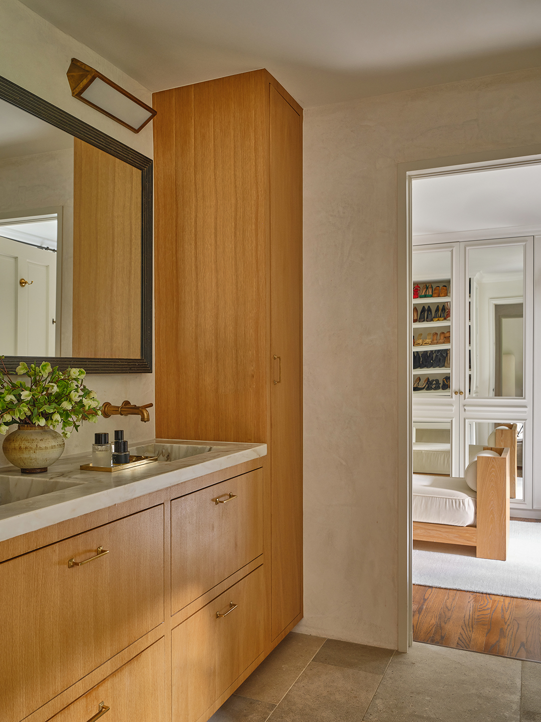 In the primary suite, Darden faced a major either-or decision: Make the bathroom larger to create space for a tub, or use that square footage to build the closet of her dreams. “I chose the closet, come on,” she says with a laugh. “It feels like my own little boutique.”