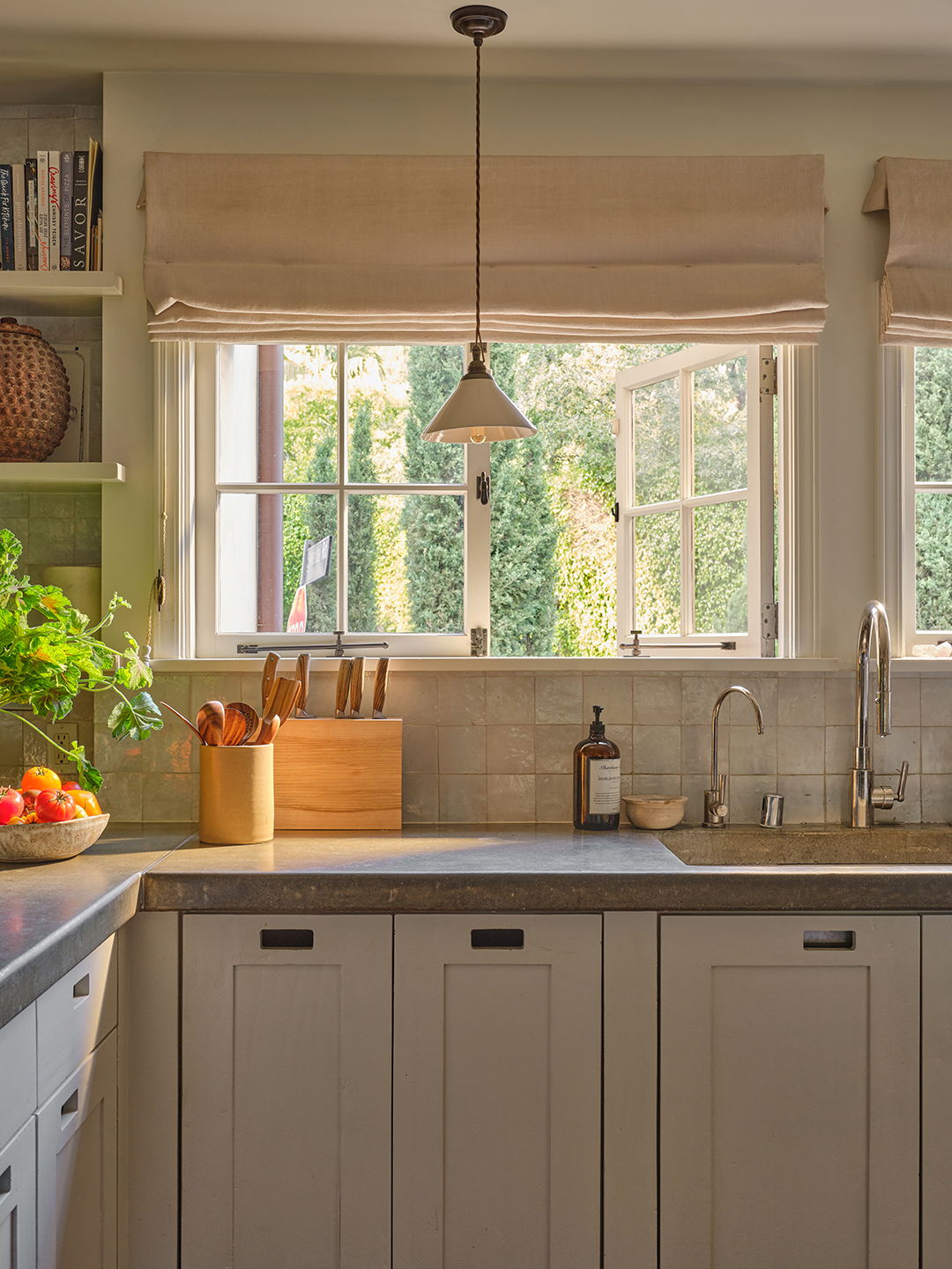 “In an old home in the hills, there’s only so much you can do to move the walls,” Darden says. “Our original kitchen felt like it had more shadows because all of the cabinets were dark, and Mike painted them white. We kept the existing windows, because they’re so charming, and the pendants make them look even sweeter.”
