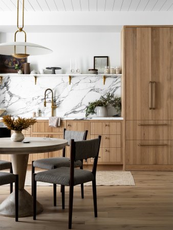The McGee children’s favorite job come nighttime is pushing the button that lowers the walnut dining table. The surface is set on a motorized stand that allows it to become level with the U-shaped banquette. The next step? Grabbing an extra cushion and—voilà!—you’ve got an extra-large bed that comfortably sleeps three kiddos. Shea took advantage of the space underneath the bench by decking it out with drawers for clothes storage.