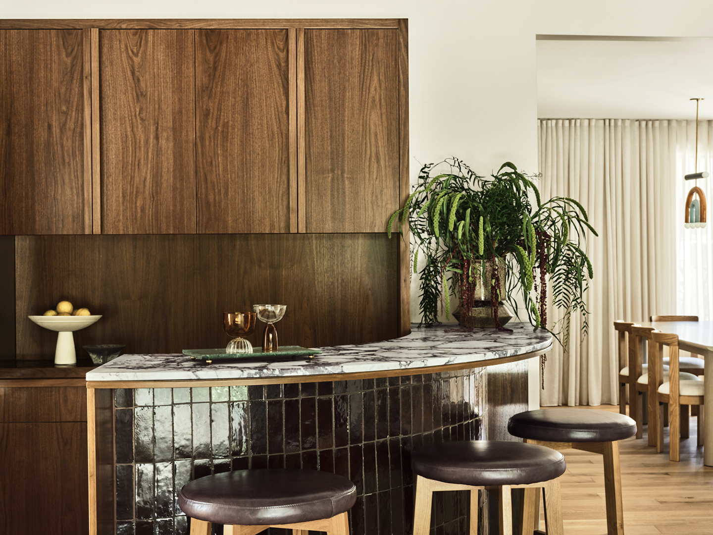 Back in the early ’60s, no family home was complete without a minibar. “My grandparents were huge entertainers, they probably had about 500 parties at this house, with my dad bartending since he was about 10 years old,” says Kass. When renovating, she replaced the mid-century bar with her own party bar, complete with modern marble and rich walnut “for a bit of drama.”
