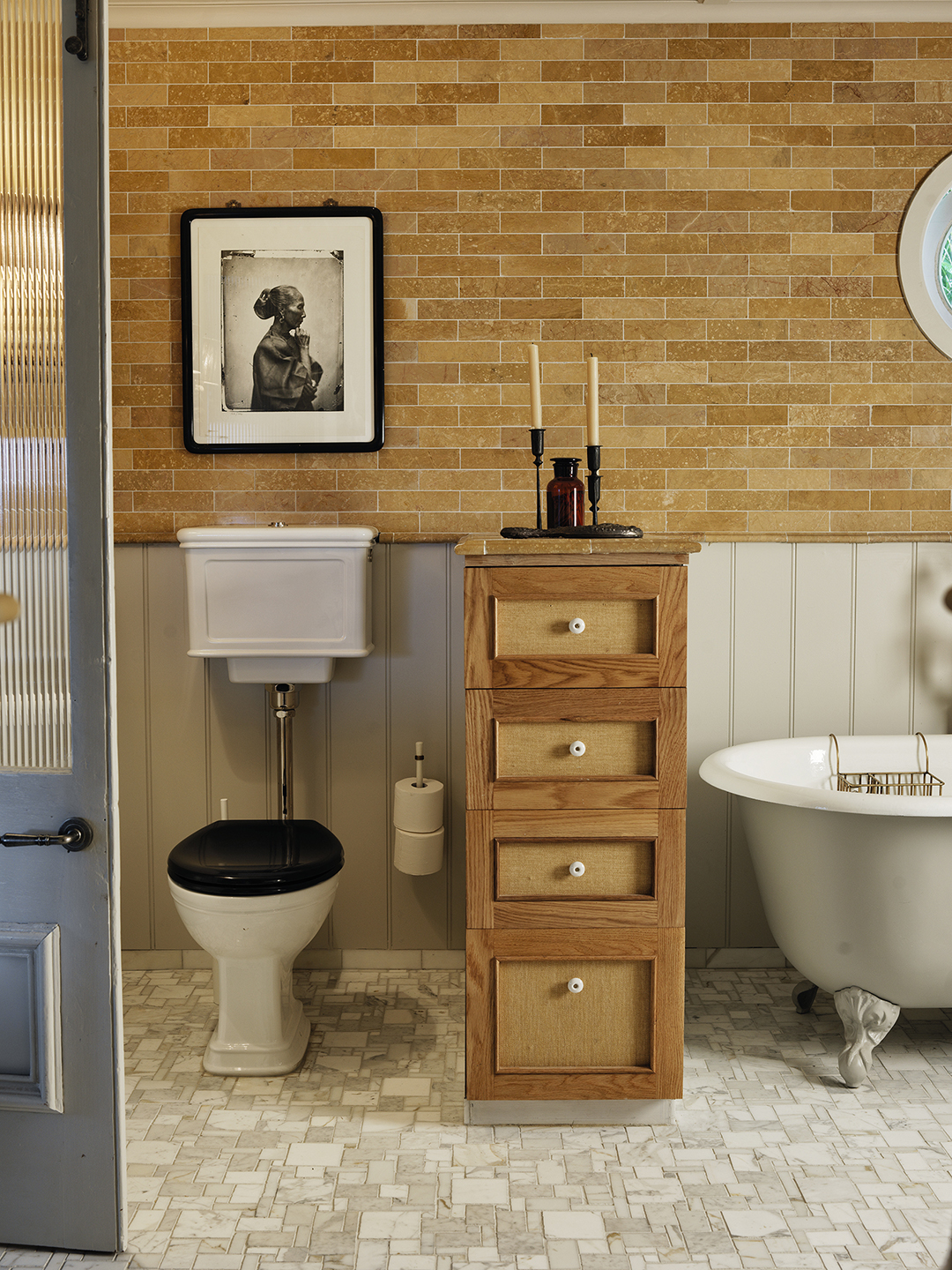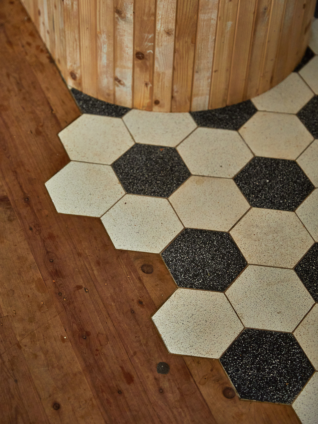 She also has a thing for thresholds and “transition” areas. Where the kitchen shifts from cooking zone to the pantry, she added a vintage cast-iron window frame and further defined the spaces by staggering hex terrazzo floor tile within the wood floorboards.