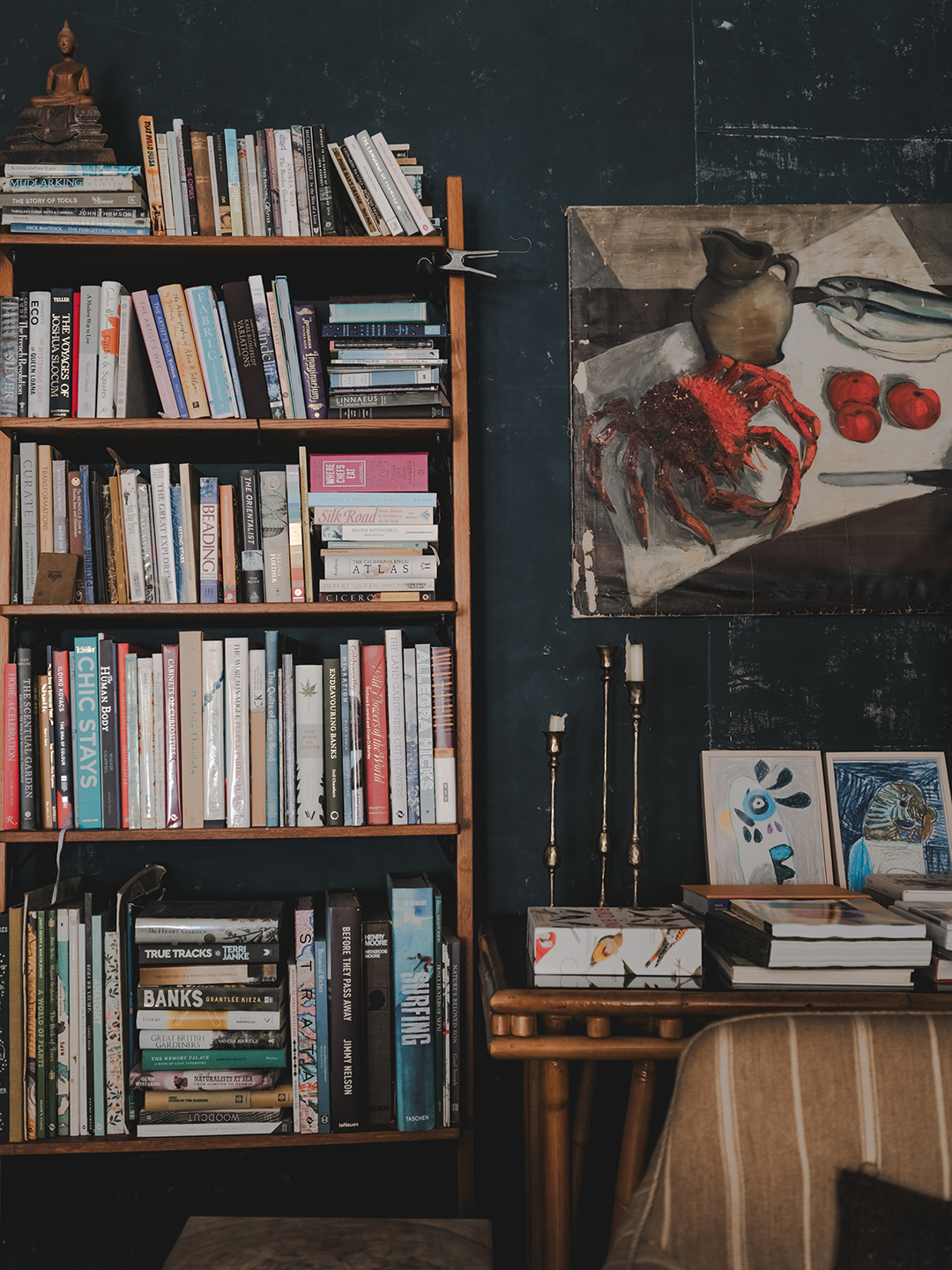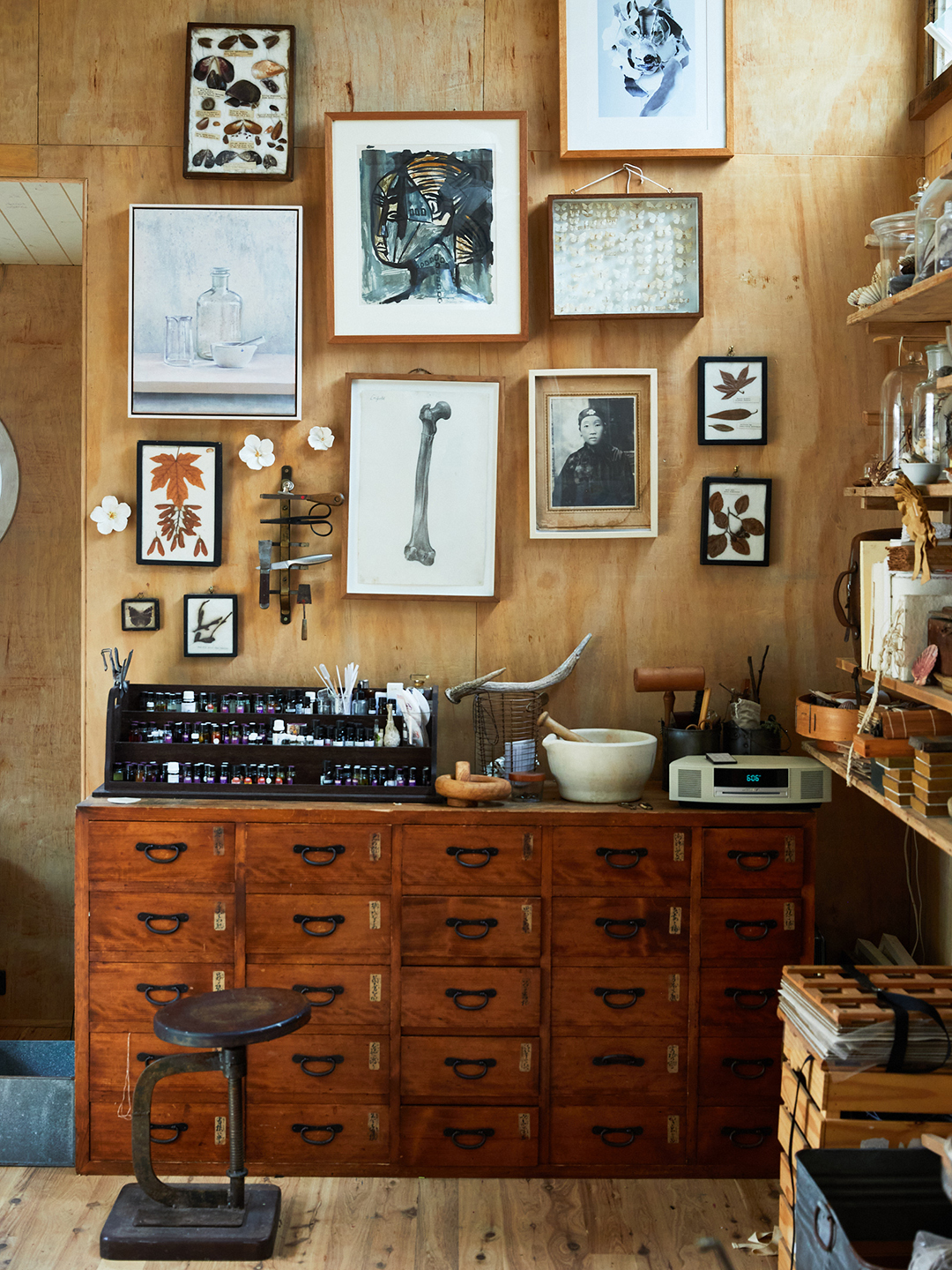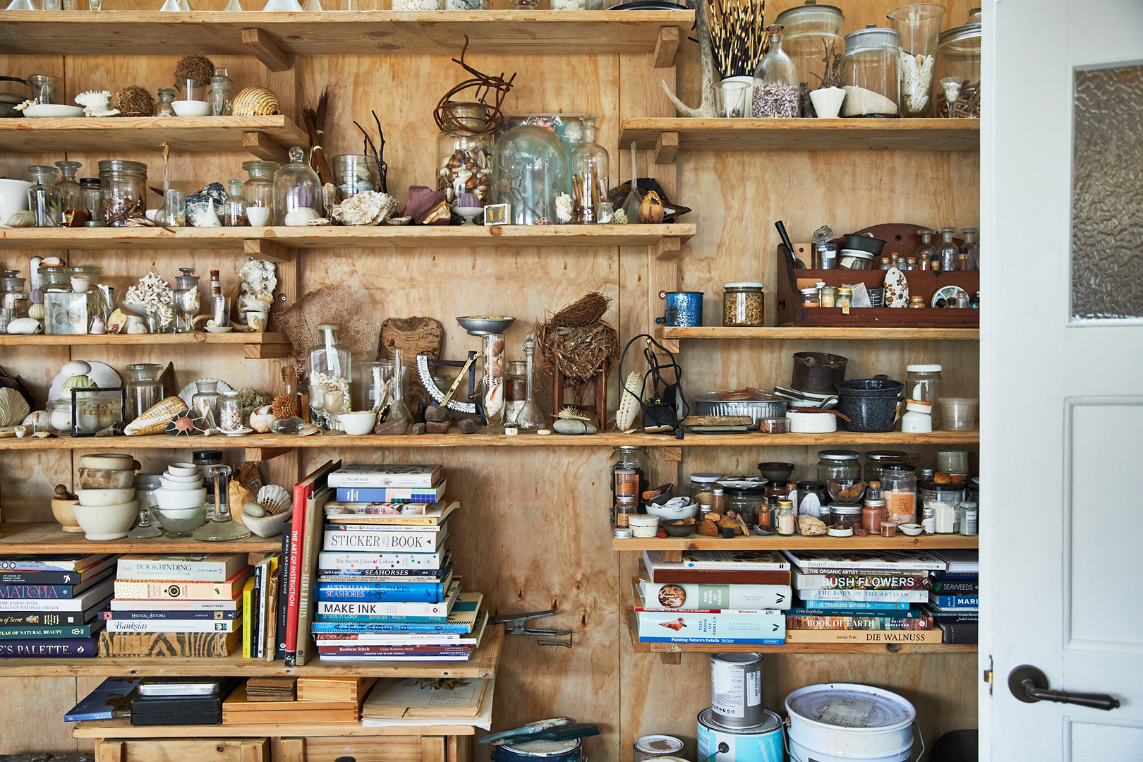 In her art studio, you’ll find an expansive shell collection she started at age 3, with many of her first finds sourced from Smiths Lake, an area three hours’ north of Sydney where her grandparents lived. She still hunts for small treasures on beach excursions, but a generous number of them have also been gifted by friends or acquired through vintage dealers. Her other hobbies—watercolor painting, botanical archiving, concocting natural fragrances—are on full display, too.