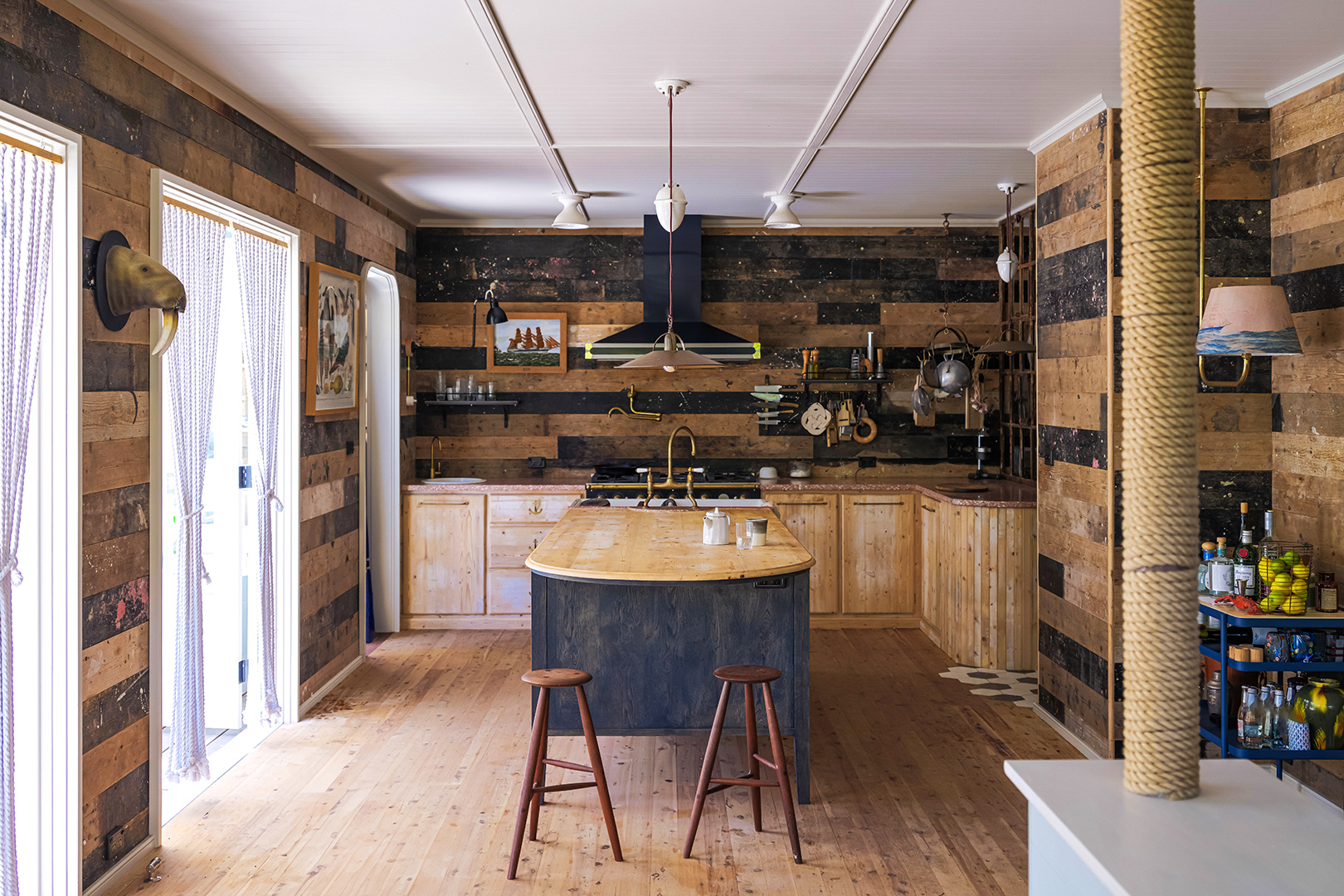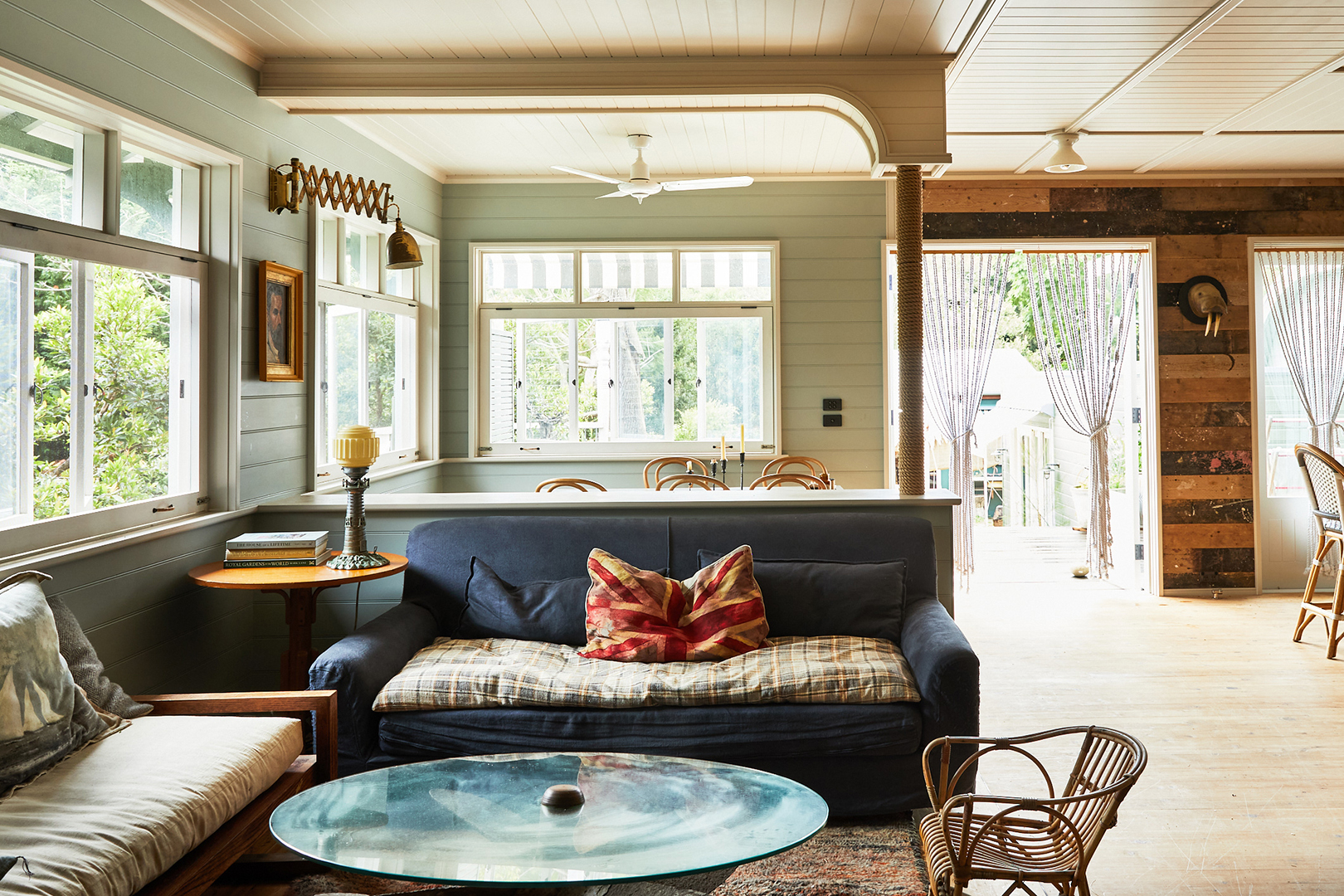 Court is fresh off a two-year-long renovation that involved shifting internal walls, replacing most doors and windows, adding decks, demolishing an old garden shed, and constructing an art studio. Still, she managed to make all that newness appear old, cladding the stairs in seagrass carpeting, wrapping poles in thick rope, and mounting interior curtains for rooms in need of a touch more privacy (and insulation).