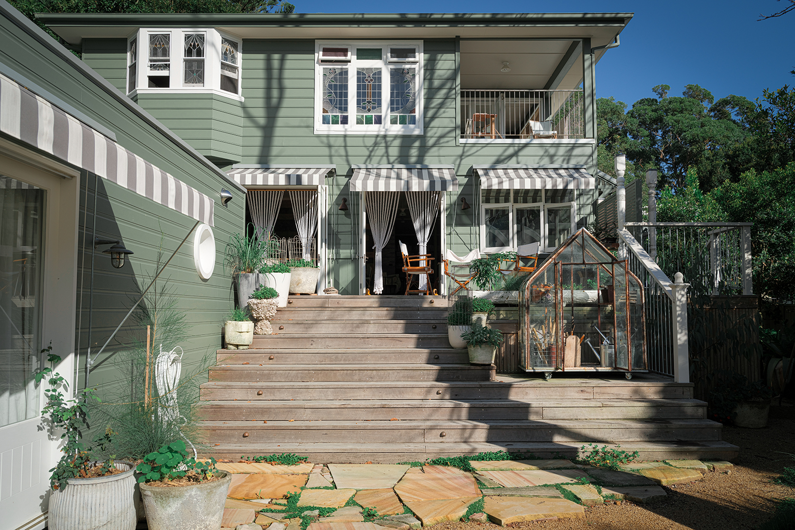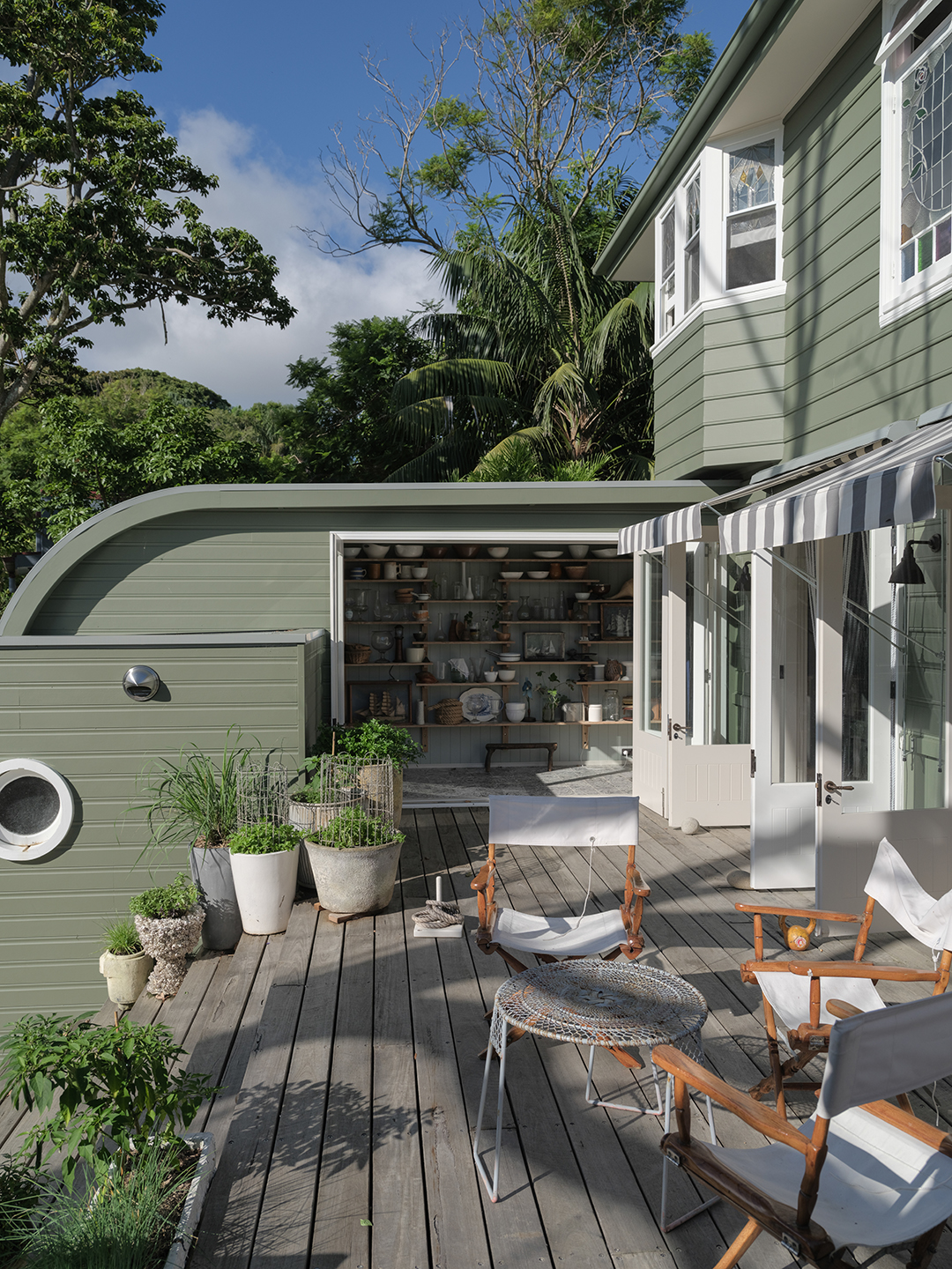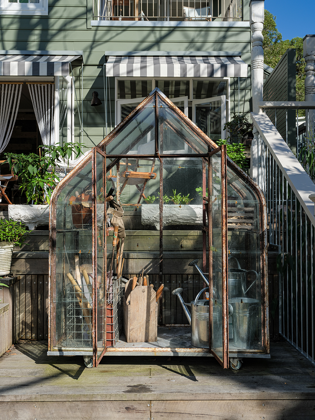 You don’t need shelves-on-shelves of shells to remind you you’re at the beach: You can feel the sea air rolling in when the doors are left open. “I am committed to catching the breeze and using it for cooling the house in the warmer months,” says Court. In the morning, she’ll drag cushions out onto the deck to read or play backgammon with her family, but the rest of the day is spent getting a little dirty. After originally building a lower platform perfect for a daybed into the new patio design, she realized her petite greenhouse fit perfectly in the spot. So she pivoted.