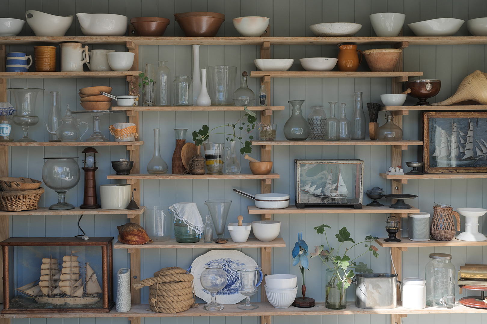 Just off the kitchen, there’s a breezeway finished with a curved roofline—a nod to some of the other rounded doorways in the house. She maxed out the open hallway with storage: The shelving holds all the vases, jugs, and mixing bowls she’s collected over the past 30 years. “The leech jars are a favorite for flowers, and all the other pieces…I remember where I bought them and they are all the more special for it,” says Court.