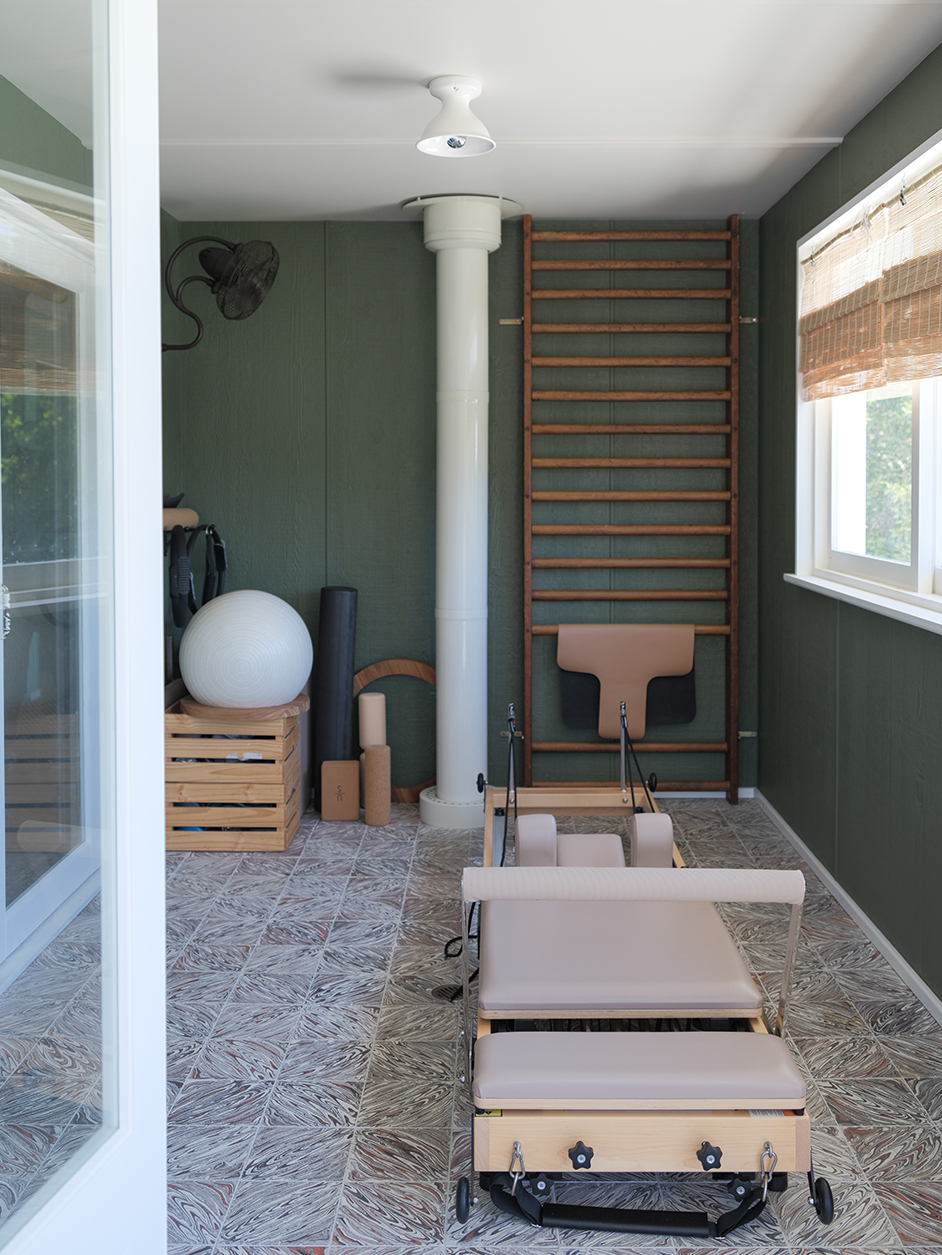 When Court isn’t passing time creatively, she’s spending it on a Pilates machine. The veranda-turned-gym is as welcoming as any other room in the house, with its soothing green paneled walls and swirly hand-marbled cement tile. Not to mention, “it’s situated off our bedroom, so there’s no excuse to not frequent it daily,” says Court.
