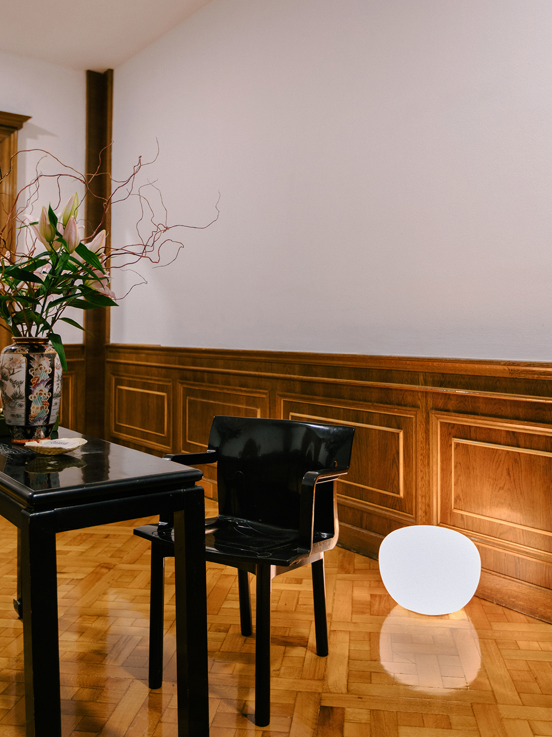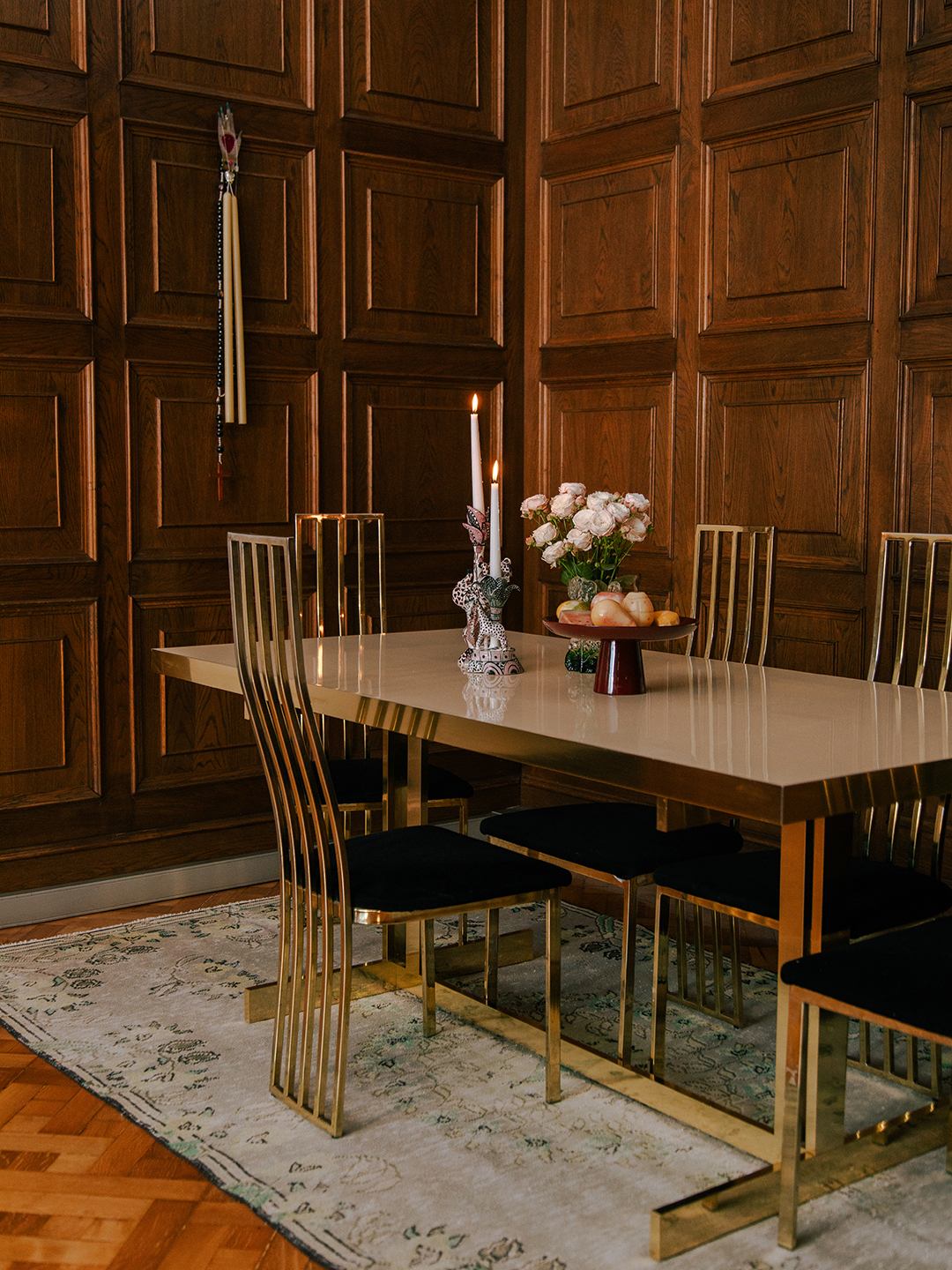 The entrance was really large and really grand and I have quite a small table in there. I was always looking for something bigger. But that was just a table that I had from Montreal that I found, it’s almost like a Chinese lacquered table with a shell inlay. Once I put a big thing of flowers on it, it sort of ended up making sense. | Chairs, Kartell.Eventually it was just like, if I’m going to be here in Barcelona, I’m going to be here in Barcelona and get the feeling, and be in the space and create a beautiful, unique place. That [lamp] I love. It seems like it’s handmade; it doesn’t have a marking on the bottom. I found it at an antique store that I go to a lot called 177 Kensington. The windows overlook one of the main streets of Barcelona, Avenida Diagonal, and I love the way the city moves around it; it’s a mix of stillness and energy. That balance played a big part in why I chose this apartment. The light, the architectural details, and the sense of peace it offers above the hustle and bustle of the city make it feel grounding and inspiring simultaneously. | Candle Holders (on credenza), Abenval; Table Lamp IKEA; Floor Lamp, 177 Kensington; Candles (on coffee table), Loewe. I like collecting memories. Anytime I travel, if I find something beautiful, whether it’s a really cool sculpture, shells, or candles, instead of buying one, I buy multiples to make sure I can give them to other people as well as have [them] myself. I always like looking at 1stDibs, mostly to check prices on some of the things that I currently have. My dining table is by Willy Rizzo, I think from the 1960s or ’70s, which is super cool. | Candles, Cereria Subira; Table, Willy Rizzo.