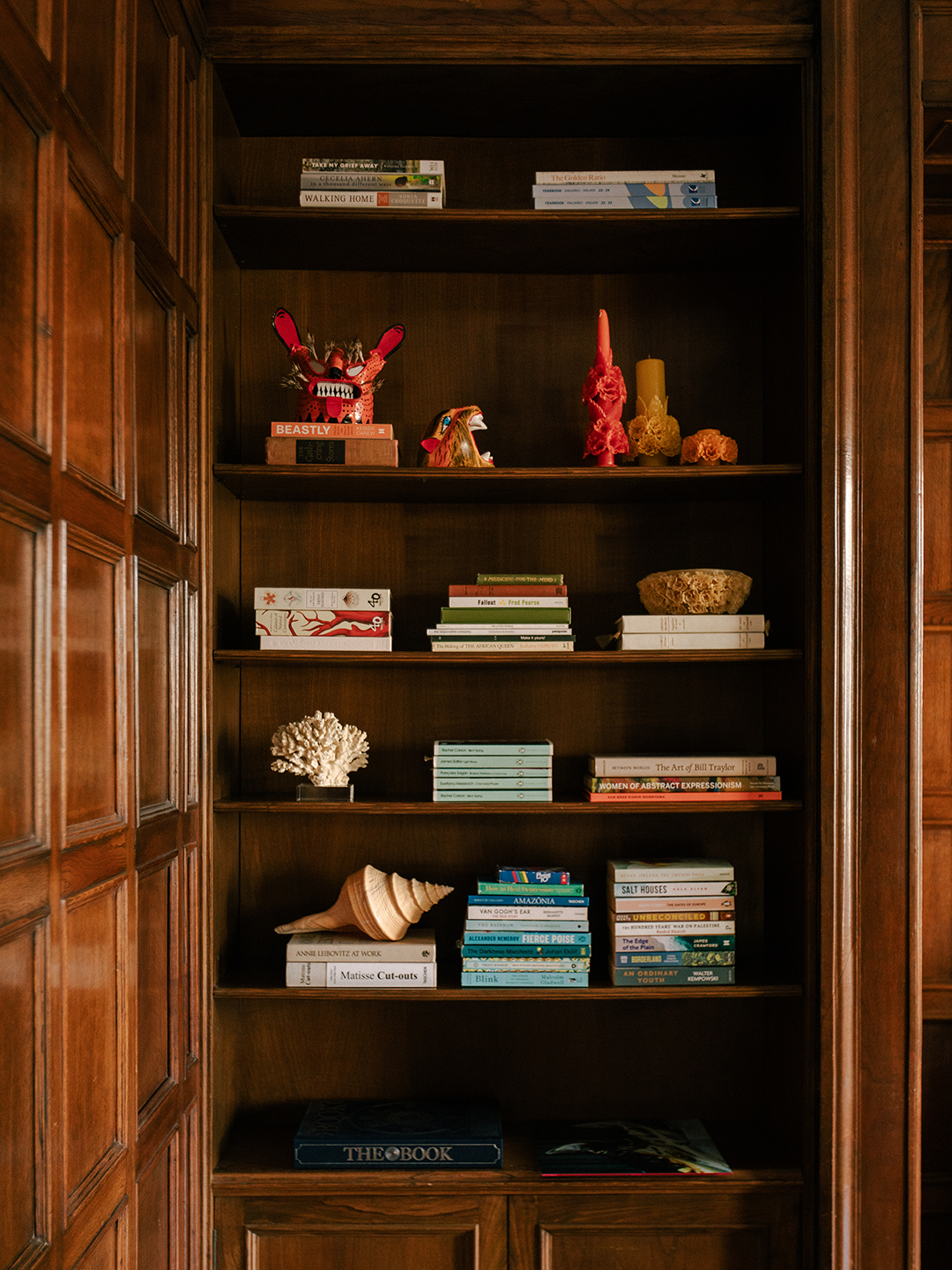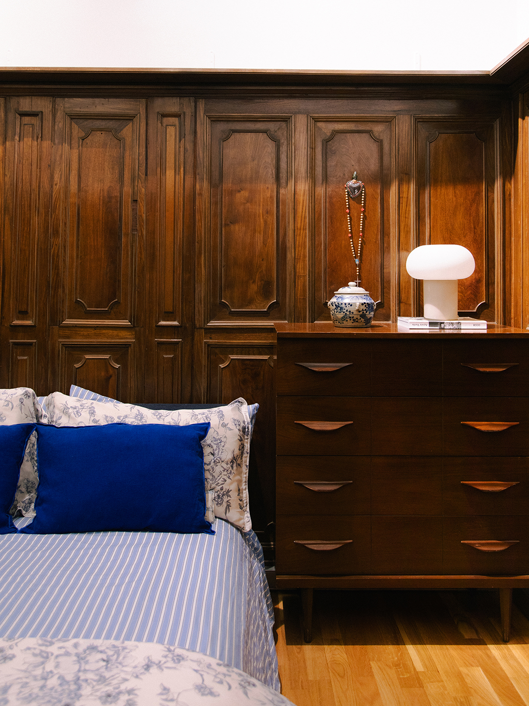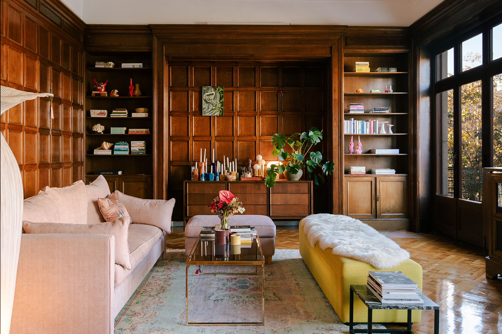 Through a four month-long apartment search, she came across a spacious four-bedroom apartment with its 19th century millwork still intact. “A couple of years ago, I don’t think dark walls were trending,” she says of embracing the walnut-clad walls in her living area. It took Kolodinski’s knack for styling, along with years’ worth of vintage furniture finds and travel keepsakes, to make sense of the space’s dramatic proportions and dark paneling.