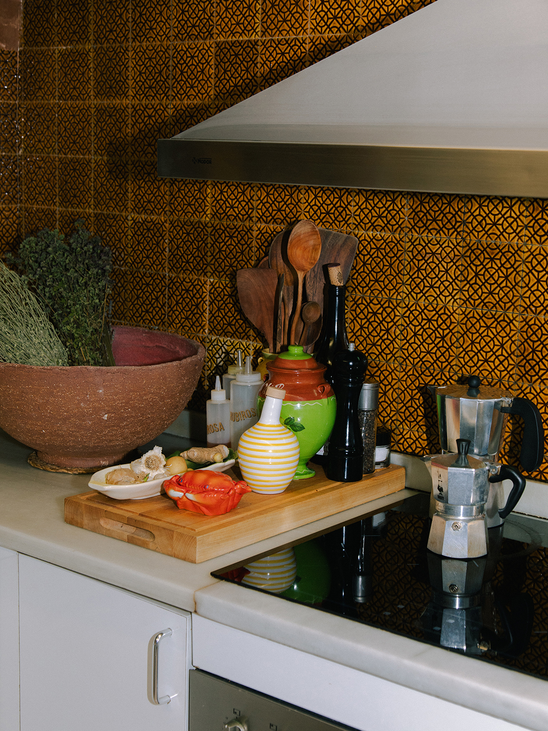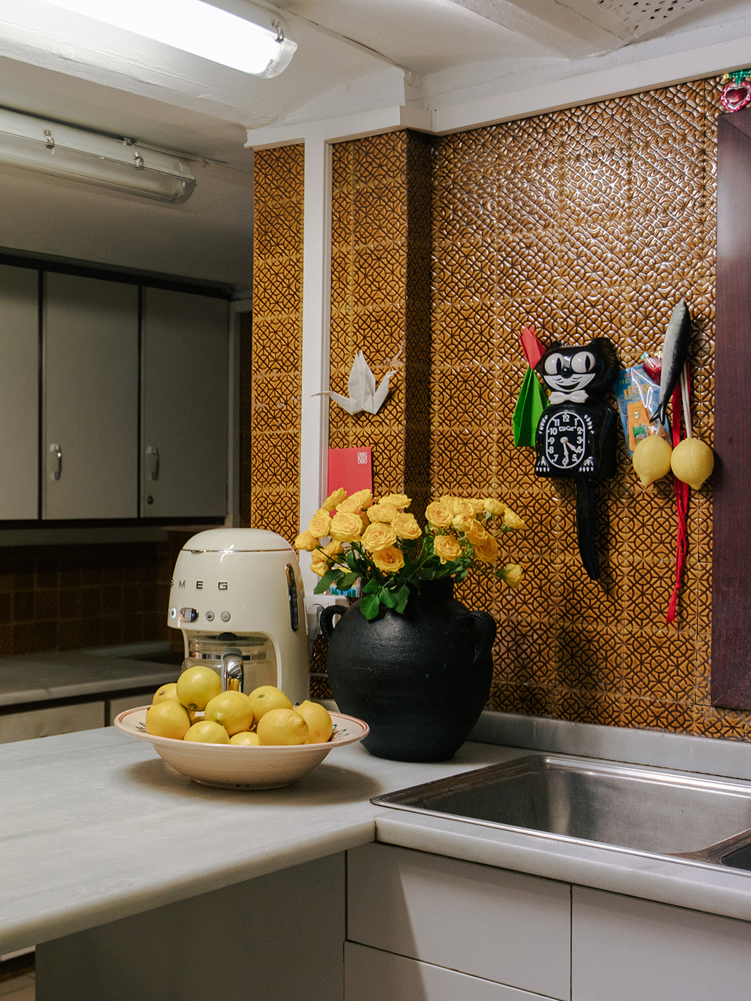 I think the kitchen is very close to original. When we moved in, [the owner] was like, “Well, I can update it if you want. We can change out the tiles.” And I was like, You know what? I kind of like this. As soon as I put dried flowers and herbs up and—I have a cute cat clock and little elements from Mexico, all over the place—it changed the space. | Clock, Kit-Cat; Coffee Maker, Smeg.