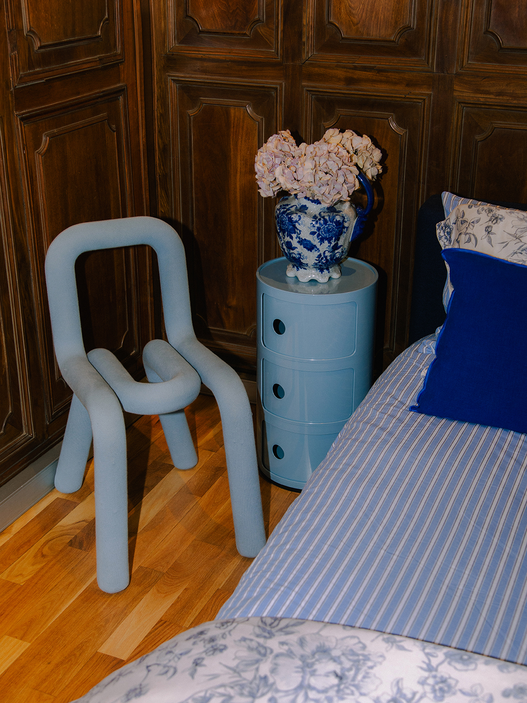 I started collecting rosaries on my travels many years ago, as they are a tiny memento of a place in time. They are all so unique once you start paying attention. This one I found in Valencia, Spain. I tried to keep this guest bedroom blue and a bit more bright and fun. It’s going to lift the space and not have it look too old or antique or dated. | Chair, Moustache; Table, Kartell; Bed, EQ3.