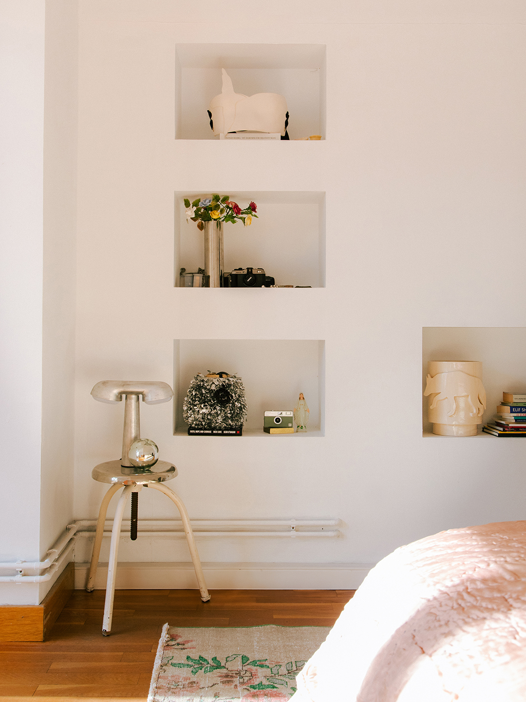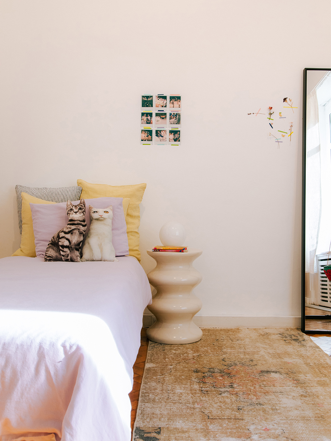 My kids, they’re both boys. They wanted purple sheets and they’re happy to have some florals. I’ll always get sheets from Merci and blankets from my travels. The cat [pillows] are from Turkey. Their beds are from IKEA—they’re actually really practical because they’re single beds but they’re stackable. | Bed, IKEA.You don’t need much in a bedroom apart from your bed and some things that you like. In those spaces I’m like, What am I going to put there so I can wake up, look at it and feel happy? For me, it’s really nice sheets and some Turkish rugs, and you’re good. | Bed, EQ3; Sheets, Merci; Lamp, Moustache.