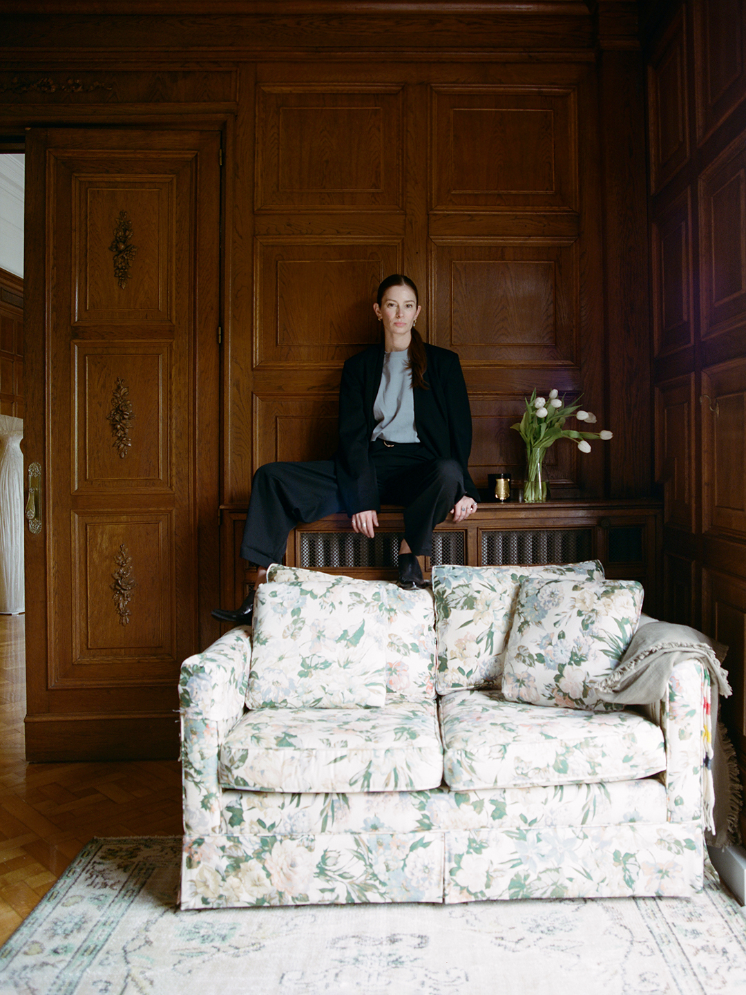 “Thank goodness everything I brought over sort of all worked,” she says. The floral couch she picked up for $20 at a Montreal vintage store and the flowerlike fiberglass lamp she later found at her favorite antique store in Barcelona look right at home against the ornate moldings and parquet floors. “It brightened and lightened everything. I think that space could have been so mature…it allowed it to be more fun,” she shares.