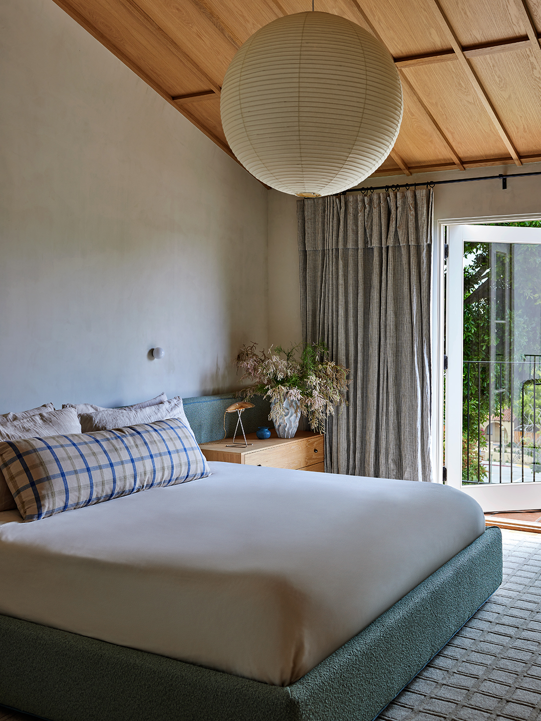 Architect Seb Zecchetto and contractor Dan Medina of HighGroundLA created a sense of warmth right off the bat by cladding the ceiling in white oak panels and batons instead of traditional heavy-looking box beams. “We thought a lot about how to adapt historical Spanish buildings and give it a new, contemporary twist,” says Zecchetto. Breer focused on selecting trim for the can lights so that they would effectively disappear into the wood. “Our whole life is trying to get rid of lighting,” she says with a laugh.