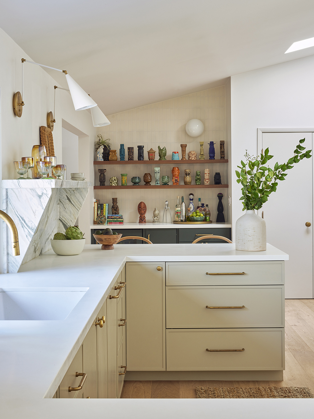 Once inside, you waltz past the Saarinen dining table, through the kitchen, to the built-in wet bar (that is, if you’re the type who prefers to take the scenic route). It wouldn’t be out of the ordinary for Amber or Mark to offer you a Blue Hawaiian or Singapore Sling at that moment—they’ve got a range of tiki drinkware for you to choose from (the teal and orange one by Japanese artist Mookie Sato is Amber’s favorite). Mark was the one who started the obsession, picking up cool mugs on their travels to Palm Springs and Disneyland. But as a former bartender, Amber can make a mean cocktail—which she’ll hand you through the open awning window over the kitchen sink. “It’s our guests’ favorite feature when they come over,” she says.