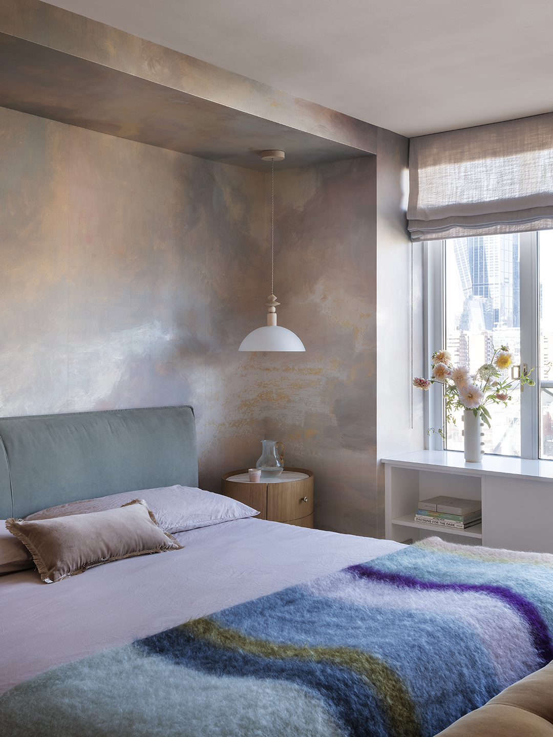 Britt: The wallpaper [in the primary bedroom] is so soothing in person, it has a bit of iridescence to it. The apartment is pretty high, so you almost feel like you’re in the clouds.