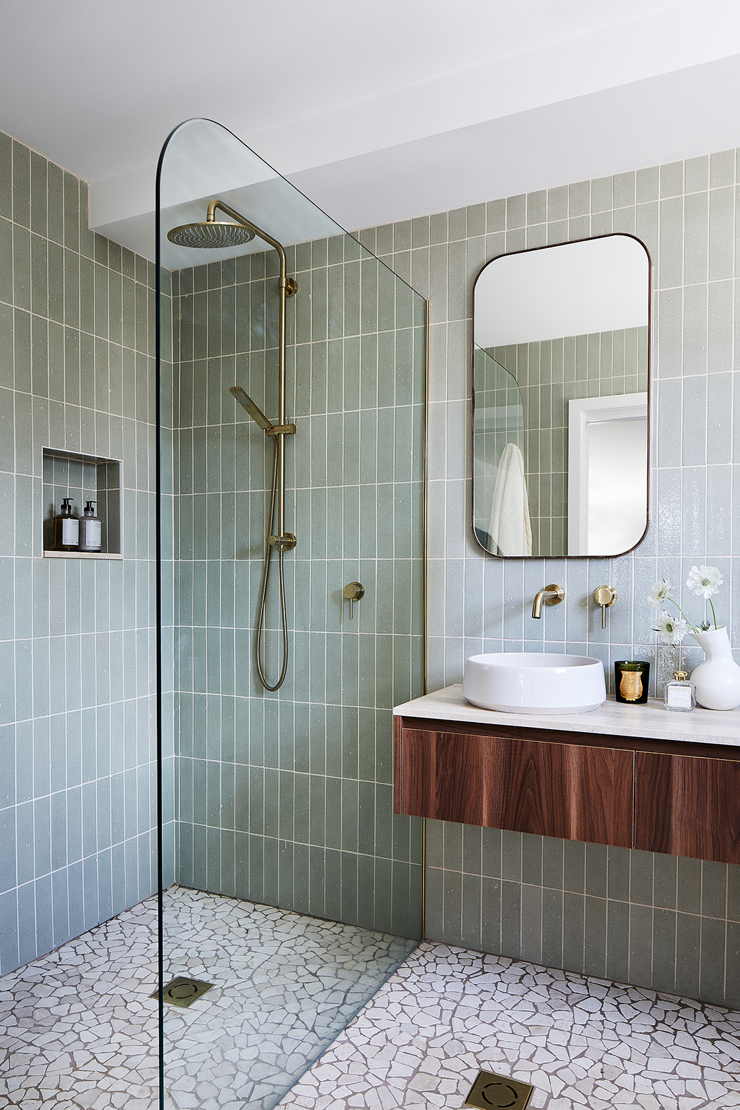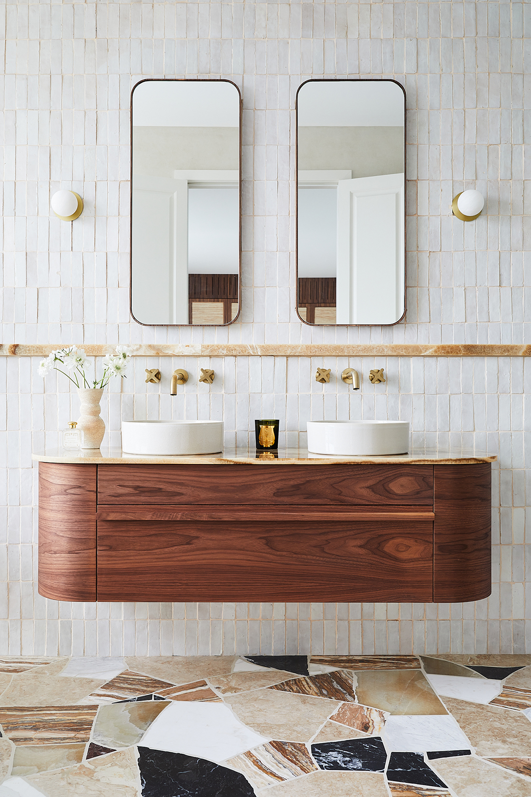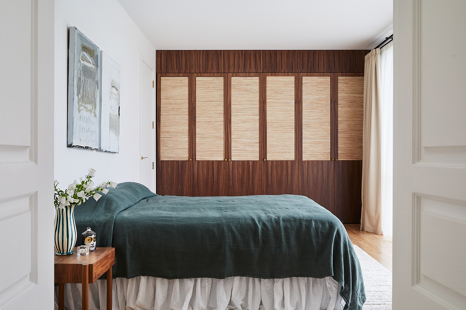 Obsessed with the look of palladiana patterned terrazzo, Jones decided to replicate the look on a much more impressive scale in the bathroom with large format offcuts of marble (some are scraps from the fireplace; others were sourced from suppliers on Facebook Marketplace and Gumtree). Jones’s dad smashed them up, and the subcontractor set them in place. The other bathrooms feature a mosaic tile version of the same arrangement, which was much easier to install. In the primary bedroom, she struck a warmer note by lining the wall in walnut wood cupboards with grasscloth wallpaper inserts and brass handles.