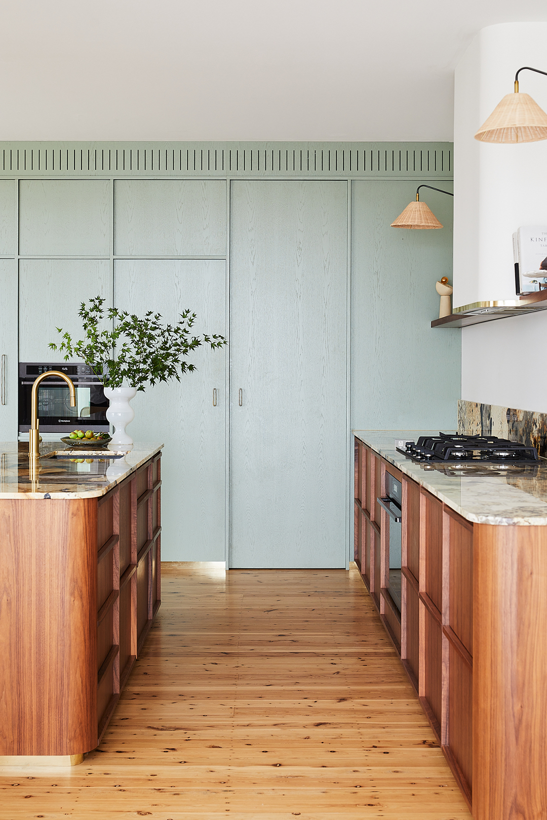 With the island being the kitchen’s hero piece, Jones didn’t want to overcomplicate things elsewhere, which is part of the reason she opted for a streamlined, plaster-coated vent hood. Rounding out the sides of the island and the fireplace in the adjacent living area created a cohesive look and also relieved a little stress. “I designed them with my kids in mind,” she says. “I was worried they’d bump their heads on the corners.”