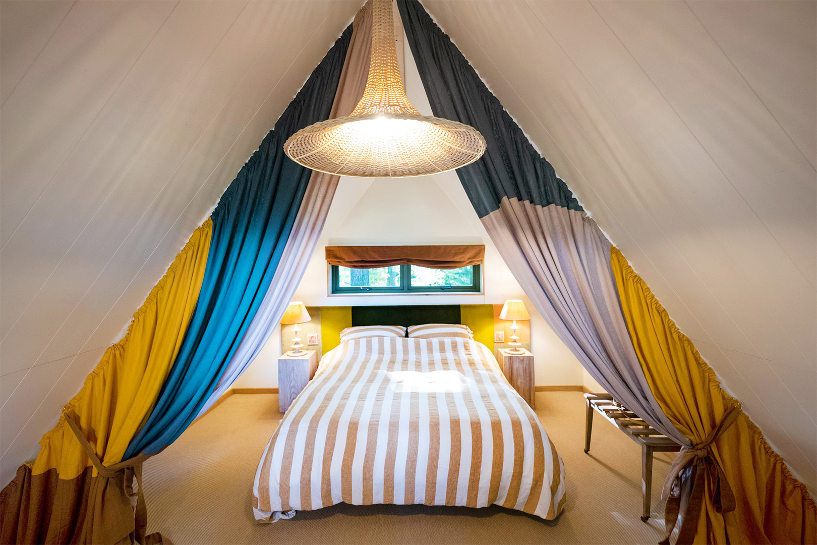 Churchward put comfort and beauty over “hard-core practicality,” so when it came to personalizing the primary bedroom, which is accessed via a ladder staircase, she was excited to get Sophie Rowell of interior design practice Côte de Folk involved with planning the space. “With a holiday rental, you want to give people a sense of escape and something special to dive into,” notes Churchward. During their remote consultation, Rowell came up with the idea of closing the space off with patchwork drapes, lending a tentlike feel. The key to getting it right? “A patient seamstress and being good at math!” says Churchward with a laugh.