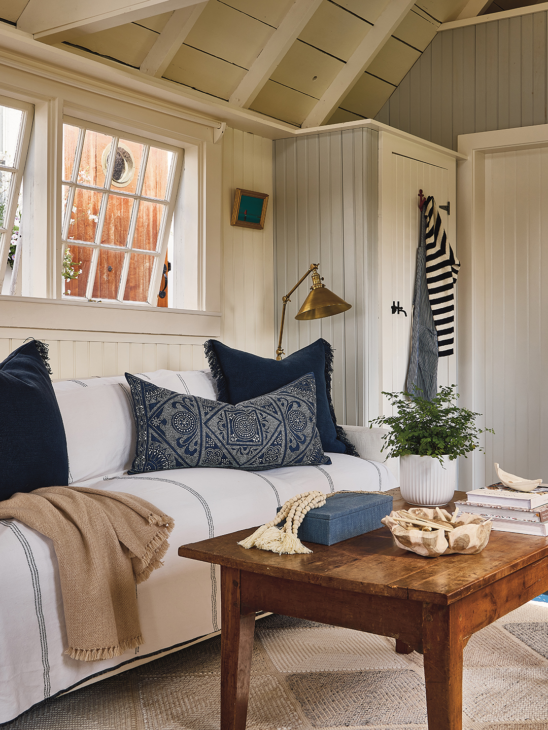 Nantucket Looms brings cottage charm to Lydia. The port of entry to the pitched roof rectangular structure is a welcoming haint blue—a blend of sea and sky. The latch windows and picket fence add a touch of authenticity. The paint-splattered floor is a fine example of early 1900s Yankee ingenuity and an idea borrowed from classic enamelware. Old worn floors were painted with leftover paint and then splattered to make them decorative. Near the door are vintage Nantucket Looms pieces—a tote bag and CPO jacket, which should always be kept within reach as an extra layer for warmth or as a Nantucket-style unisex dinner jacket, and an American flag embellished with scallop shells by Nantucket Looms Master Weaver Rebecca Jusko Peraner. The ship’s galley-style kitchen showcases early island curiosities, including a pennant and old Nantucket Wharf Rat Club mug. Preparations are underway for a sandwich lunch on the wharf. A ship’s light hanging from the ceiling adds to the nautical flavor of the cottage.