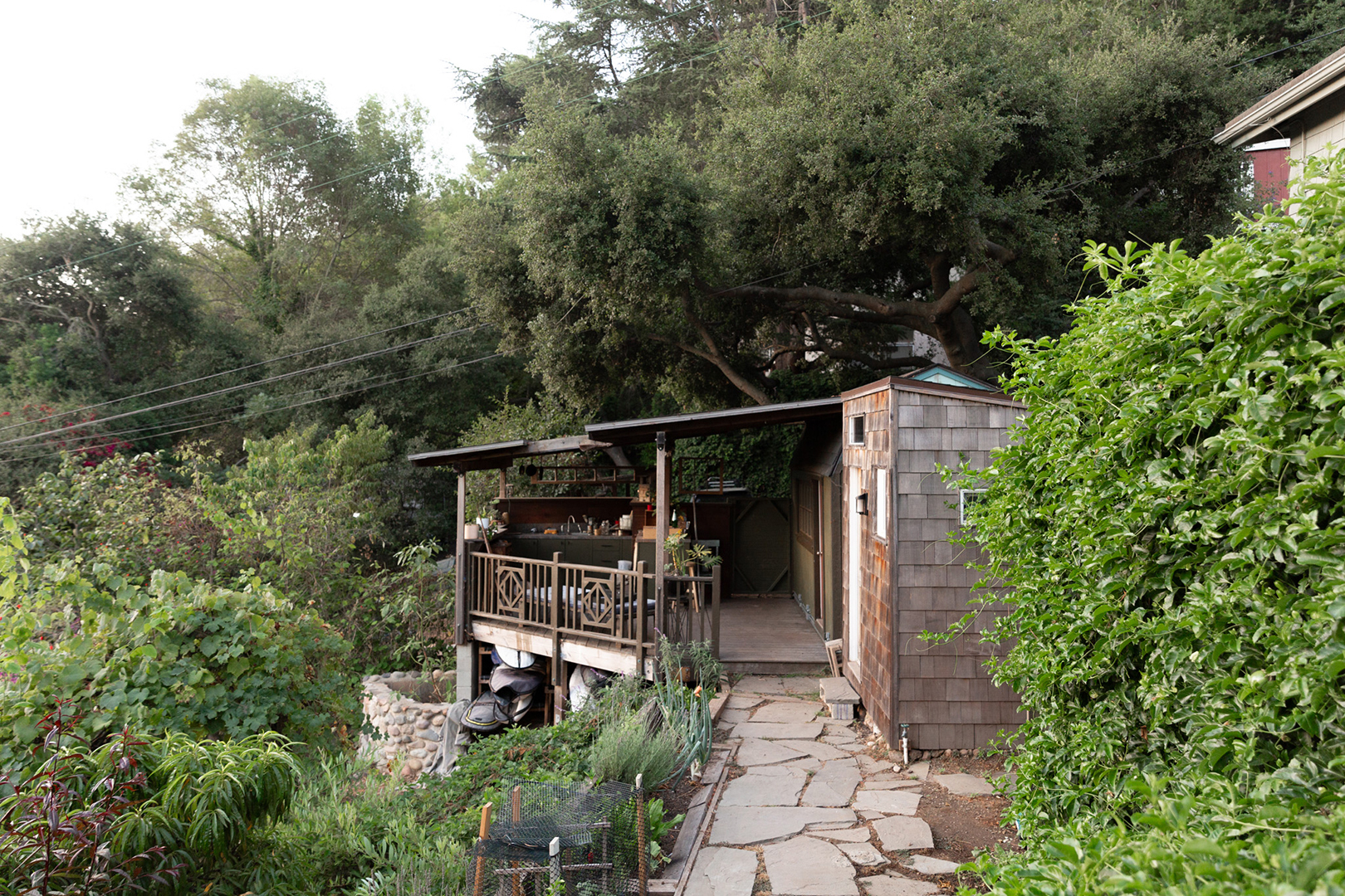 The 750-square-foot upper story is what Hutchens and Seagraves technically call home. Downstairs, they converted an old bedroom into a full-on ceramics studio outfitted with both an electric and gas kiln. Further down the hill, past the large passion fruit tree, is a separate building where Hutchens paints and does occasional graphic design work (she’s behind the logo at the Topanga Farmers Market). Seagraves and Hutchens have it all right there, which was part of the draw when they bought the house in 2021.