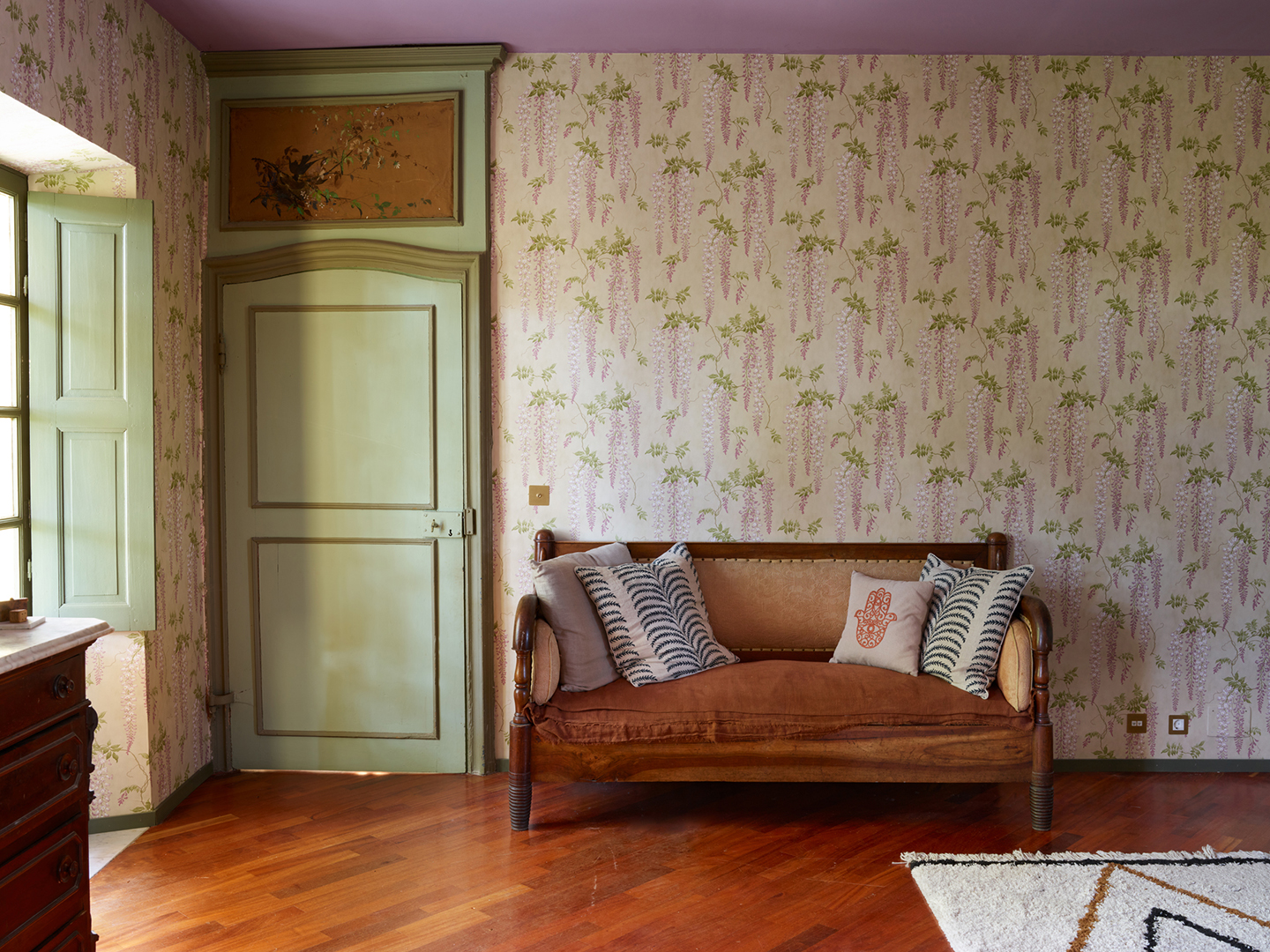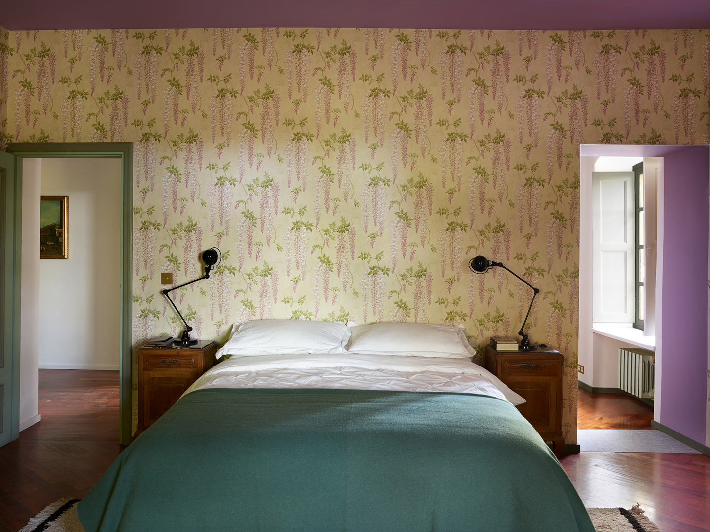 There was no budget for major structural work, so she made sense of the layout by allocating six bedrooms, four bathrooms, two studies, two kitchens, and two lounges. For herself and Leigh, she created an indulgent primary suite with an adjoining bathroom and dressing room. The cue for the space’s wallpaper was the century-old wisteria plant growing outside, beloved by the house’s former owner, a woman named Claudia who lived there with her granddaughter, Lucrezia. Watson-Smyth named the room in Claudia’s honor. “We wanted to pay tribute to her as the matriarch of a much loved family house,” she says. Painting the freestanding bathtub next door a coordinating shade of lilac was the next logical step.