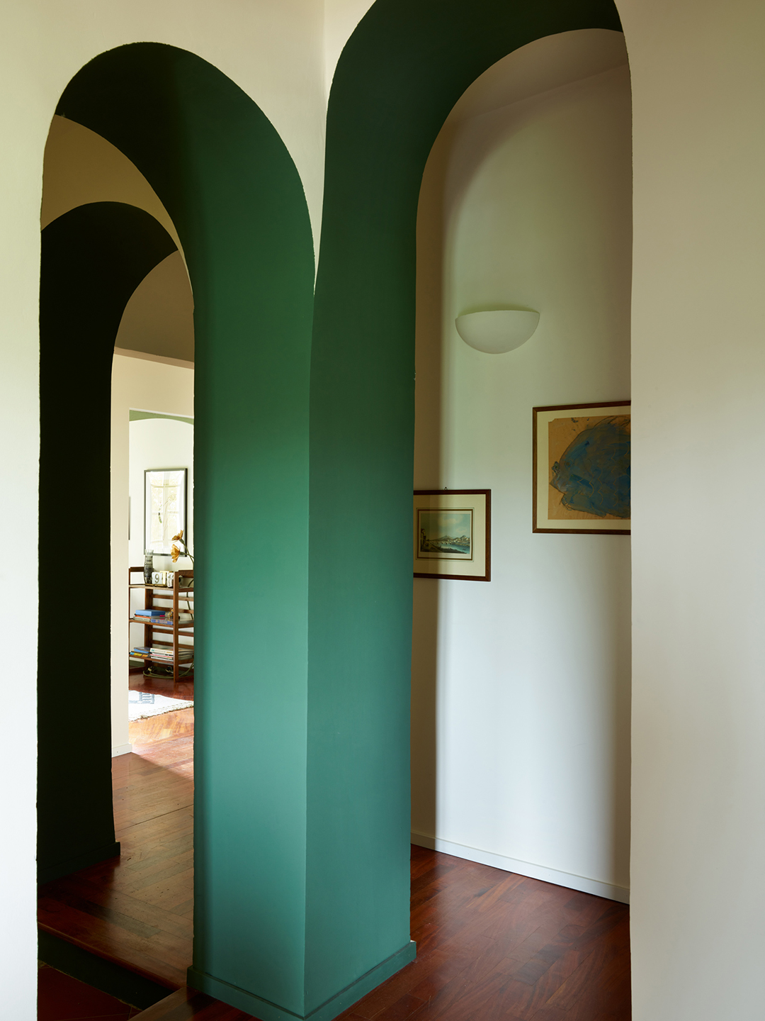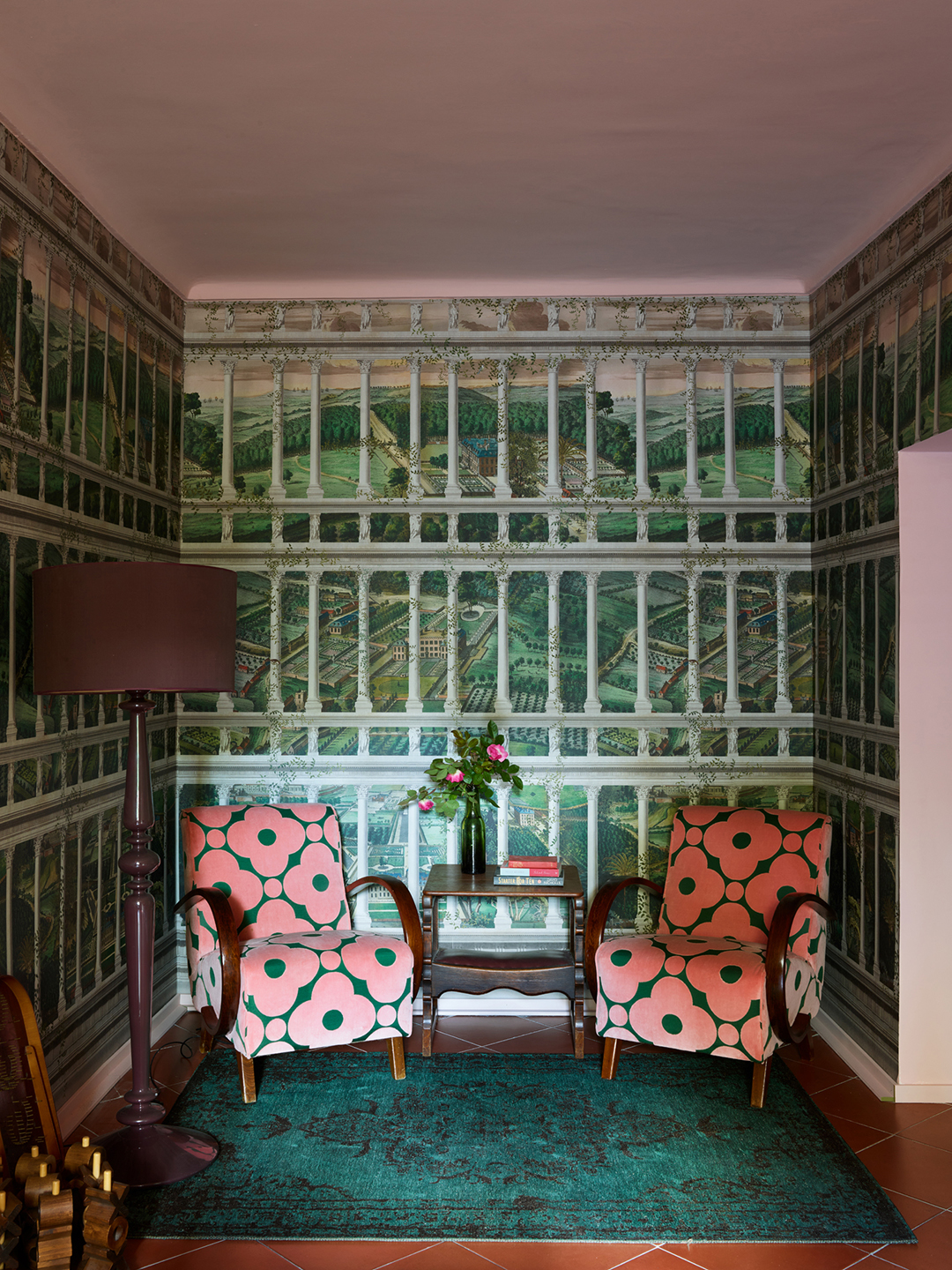 When Watson-Smyth’s adult sons come to visit, there’s no shortage of spots for them to retreat to. A once awkward corridor is now a cozy game room wrapped in an immersive mural and complete with a card table. The upstairs sitting room (previously all white) has been made over in a bold green and swathed in a Liberty wallpaper. Taking up the carpet revealed old terracotta tile sadly ruined beyond repair, so they ripped it out and leaned into the concrete, which Watson-Smyth, seeing only the positives, plans to eventually polish. “It works because I like the juxtaposition between it and the incredibly luxurious wall covering,” she says.