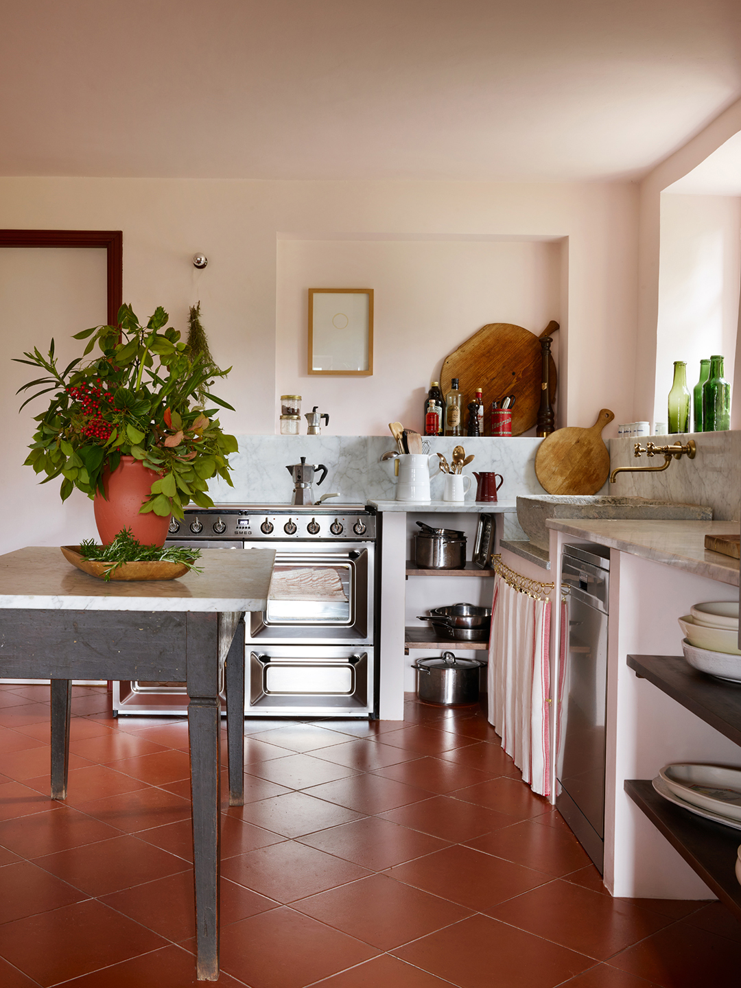 A seasoned renovator who has created an interior design course to help others, her aim wasn’t to make the historic home appear brand-new but rather for it “to look like we’d moved in and just freshened it up.” They fell in love with the faded wall colors and embraced a typical Italian country kitchen with a simple marble countertop and open lower shelving.