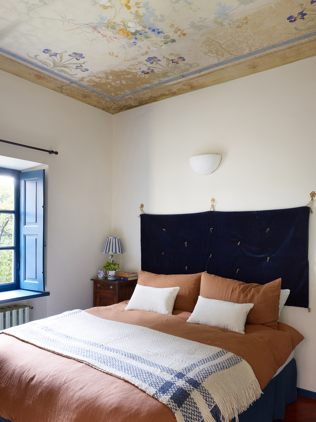 Watson-Smyth ran with the theme of naming the bedrooms: The one with the floral ceiling is called Iris, while the pink and yellow suite is named Gloria after Leigh’s mother, who loved Italy and had an apartment in Liguria for 30 years. To give each space even more personality, she collaborated with the paint brand Graphenstone to create a series of 12 hues (available to shop). The fact that Graphenstone paints are breathable—in other words, actually improve indoor air quality and prevent mildew—was a big draw. “When you’re not in a house for a period of time, you have to be really careful about damp and mold,” she says.