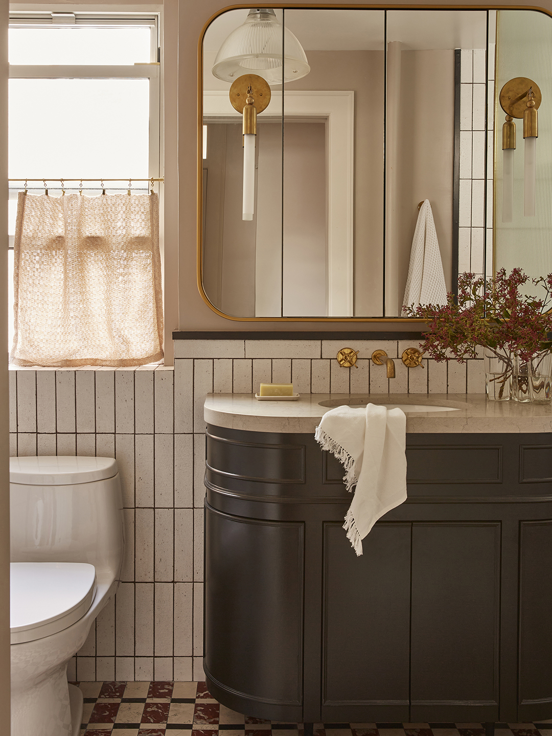 Moving the plumbing to expand the bathrooms proved to be tricky—and in one of the spaces, not possible. Because of the apartment’s location in the building, the natural light wasn’t the best either. But no challenge could keep the designers from giuving the couple the ultimate warm welcome to Manhattan. Ahead, they give us the low-down on the reno.