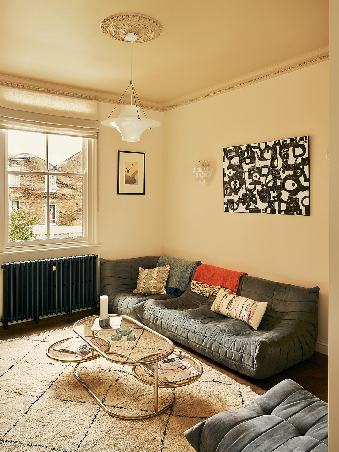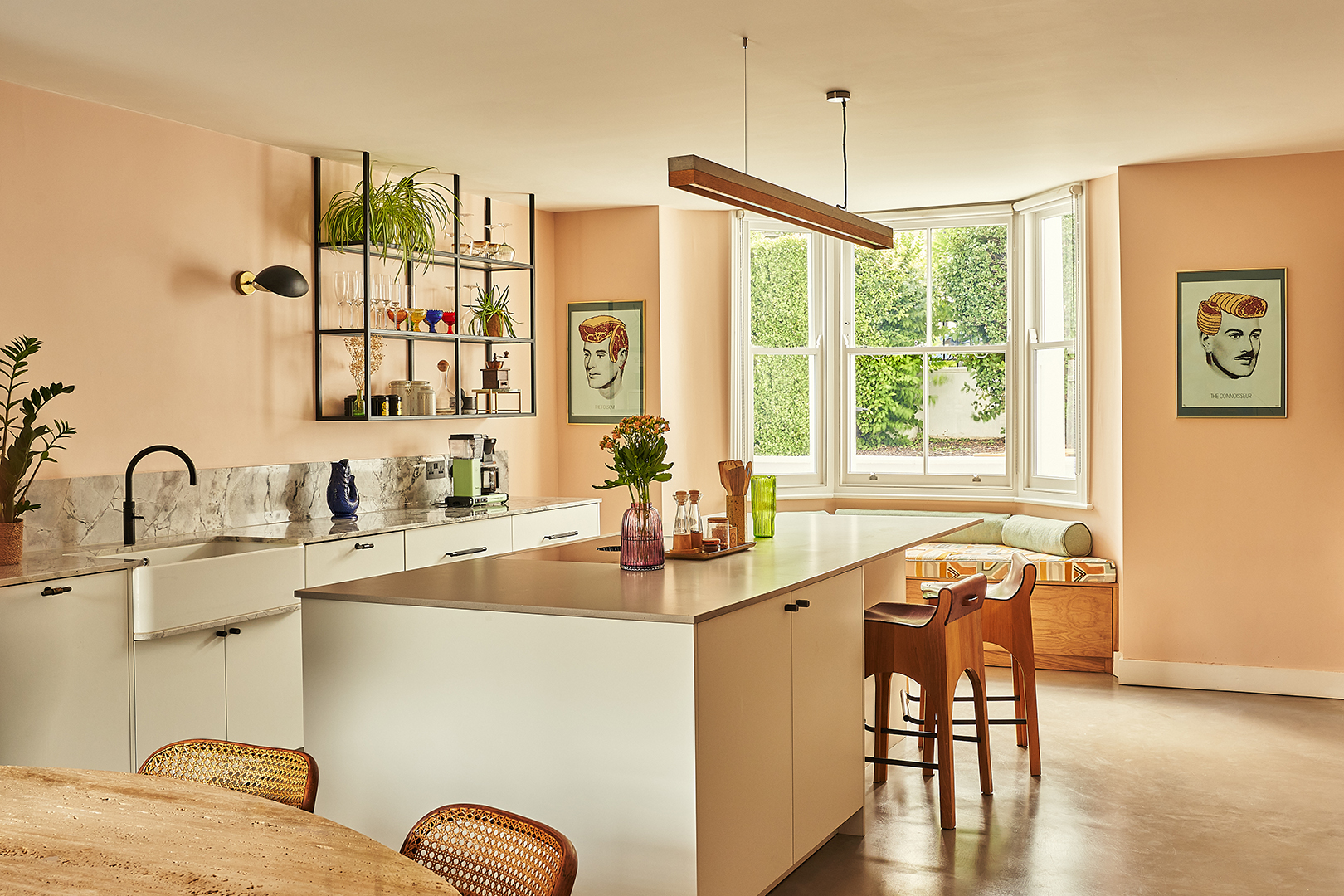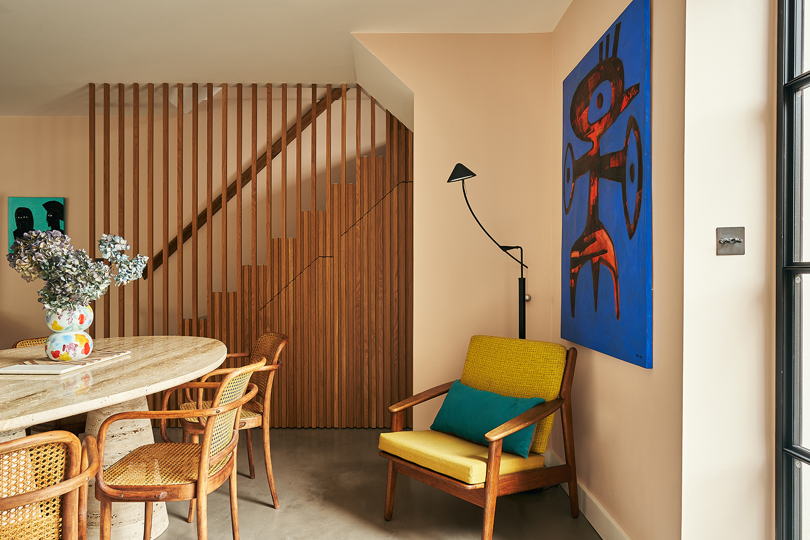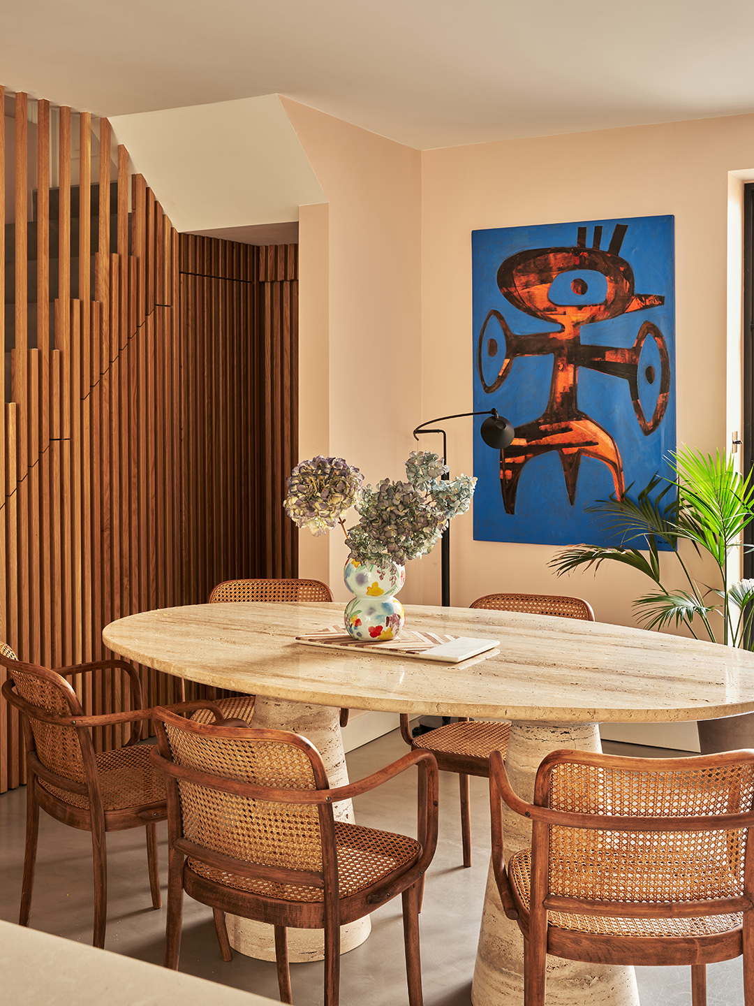 We are really glad we worked with a kitchen designer who learned about our cooking habits, how we like to host, and was able to marry functionality and design. They convinced us to try induction, which I was anti at first but now I’m so convinced on (we have a Bora extractor so there’s no vent hood hanging over us). We also put in a hot water tap so we don’t have to use a kettle all the time. My husband got a super-sized wine fridge, which he was very quick to fill up. | Wall Color, Setting Plaster by Farrow & Ball.On our last trip before Covid, before we had our daughter, we went to Valparaiso, Chile, and saw these paintings by an artist named Felipe Castro in a cafe. We asked about them and he was quite happy to ship them to London, including this blue one. Since then, we’ve been following him on Instagram and bought two more pieces. The cabinets under the stairs are mostly for pantry goods, and there’s a spot for grocery bags. I saw some photos of restaurants with these wooden slats, which I thought was a cool idea for adding more texture and character to the space. The travertine dining table weighed around 900 pounds. Four people had to deliver it, so we can basically never move it. It stays with the house.