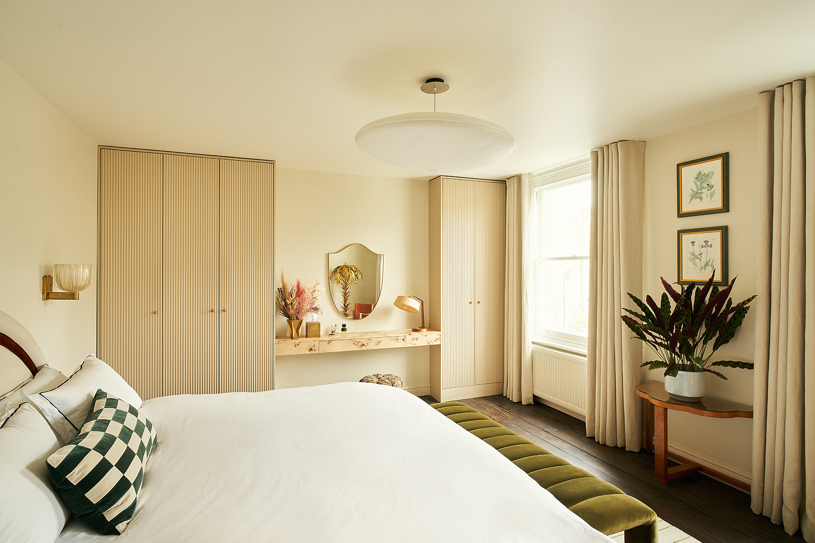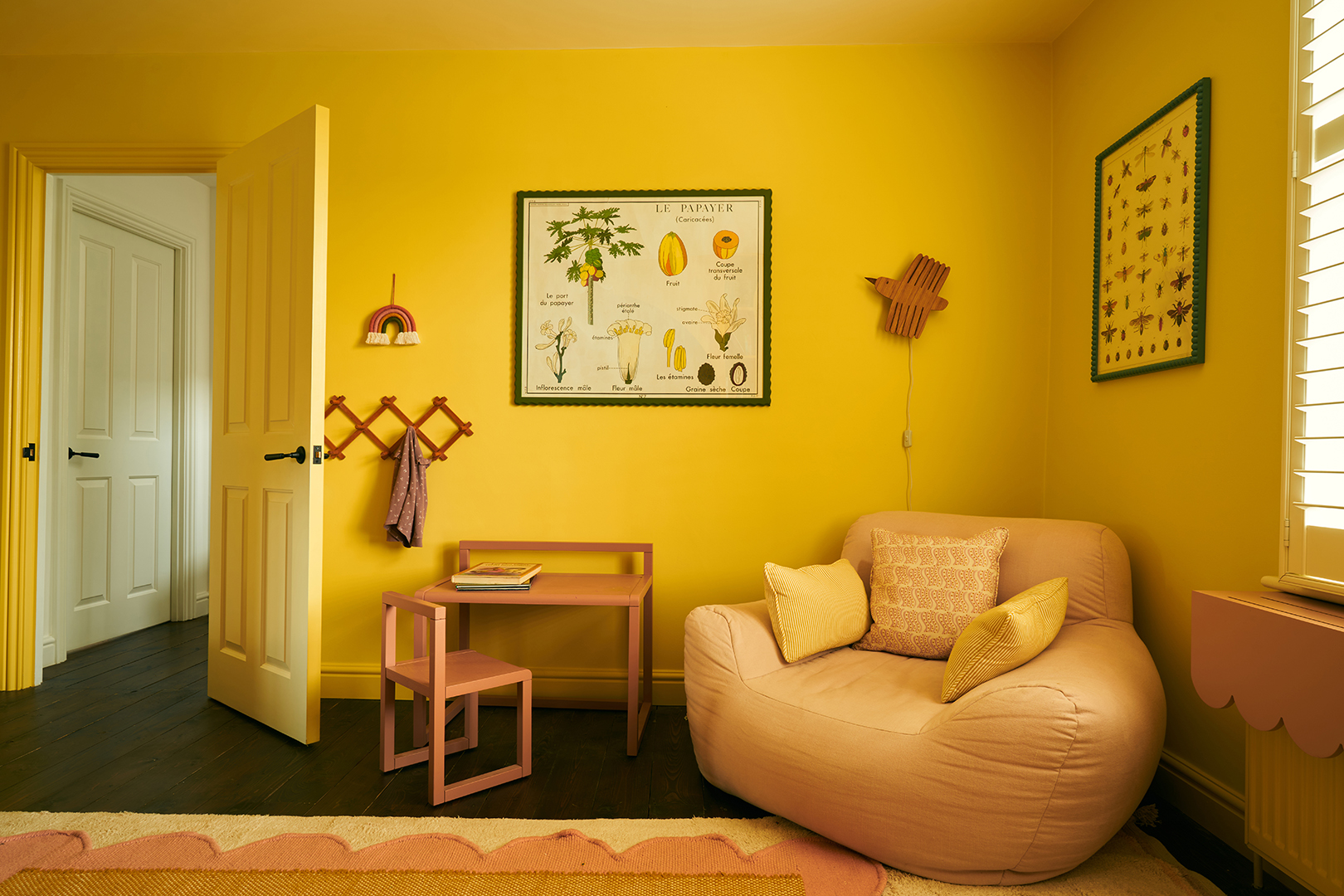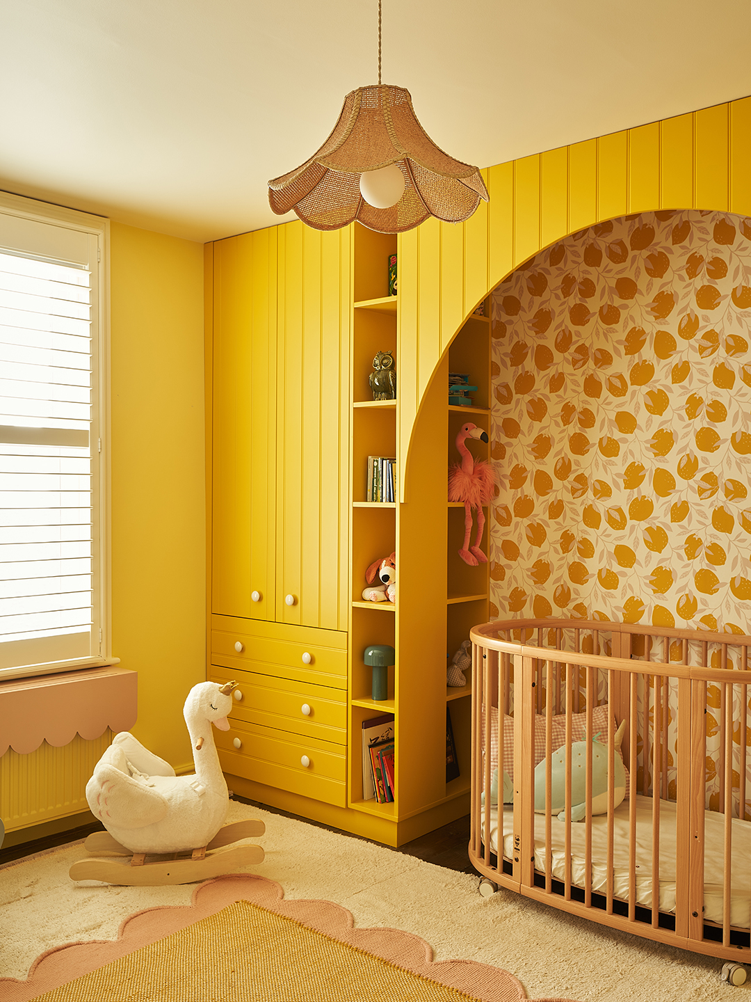 We had an old-fashioned gray and wooden headboard before. We were a bit inspired by Soho Home to make this arched one that’s covered in velvet and bouclé (we didn’t want too much bouclé because it can’t survive our cat). The fluted closet doors were inspired by a cottage we stayed at in the Cotswolds that had something similar. When we did our daughter’s room, we thought, how can we have a space where she can grow up in? I wanted it to be neutral and joyful, so we went with yellow. She loves yellow.| Chair, Loaf.We needed a lot of storage because kids’ stuff accumulates, and big handles on the wardrobes so she can open them up herself. The lampshade is vintage. Since this photo was taken, we’ve upgraded her crib to a secondhand IKEA toddler bed that’s metallic and pink. | Millwork Paint Color, Lamplighter by Craig & Rose; Walls and Trim Color, Dayroom Yellow by Farrow & Ball.