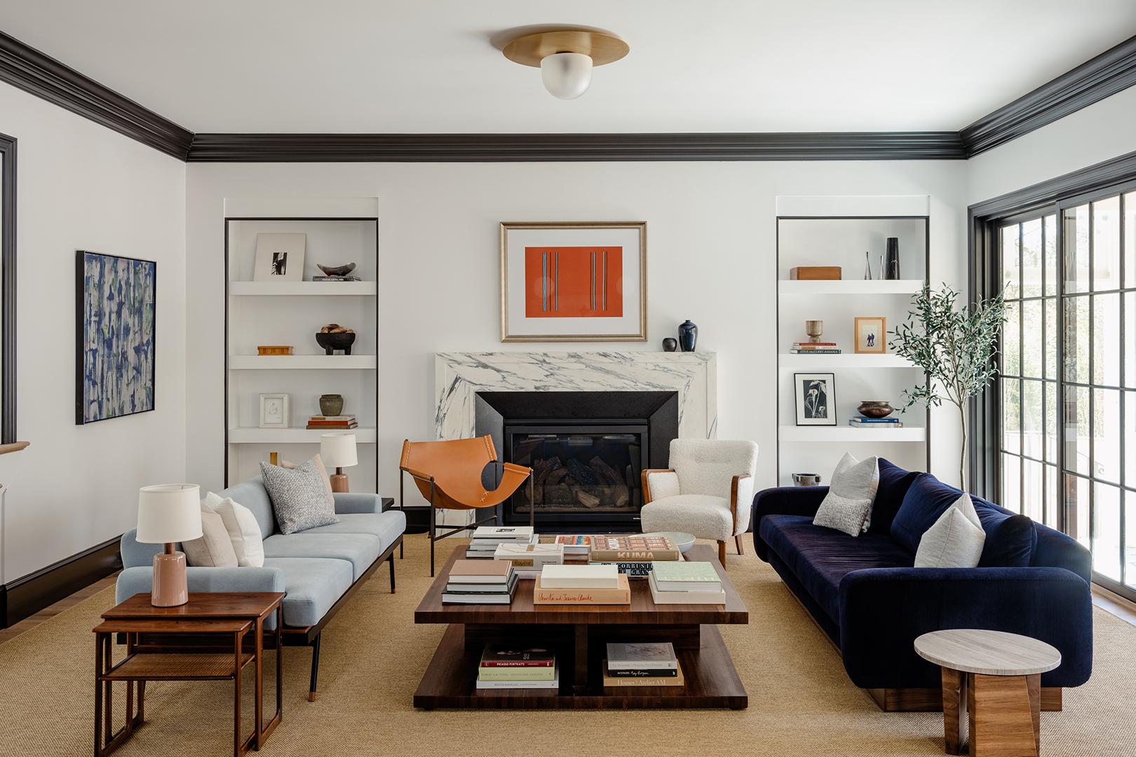 We never want it to feel like the blue room, the green room, the yellow room. We like to use color as we did in the living room, which is basically a white and black palette, but with a beautiful blue sofa. There are so many other less obvious ways [besides walls] to use color through art, through trim, through doors, through cabinetry, through lighting.