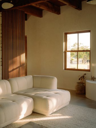 The absolute first thing I chose and ordered for this home was an incredibly comfortable sofa from Rove Concept, upholstered in a soft cream bouclé. With one arm and an open side, it immediately made the living space feel more expansive. I love modular furniture for its versatility—you can move it around and adapt it to any space. In this compact layout, the sofa became the key piece that allowed for more seating and space for entertaining.
