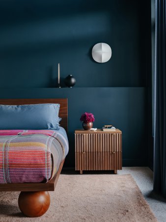 Definitely, all the custom millwork! The biggest challenge with the bedrooms was their size—they quite literally only fit a bed. In the main bedroom, [we] designed a floating platform bed. To maximize function, we built two small niches into the headboard, each just big enough for an iPhone, with built-in outlets for charging and a switch for the sconces above. The niches replace nightstands, eliminating the need for extra furniture. Millwork is often dismissed as too expensive, but in compact spaces, every detail is intentional and made to work harder.