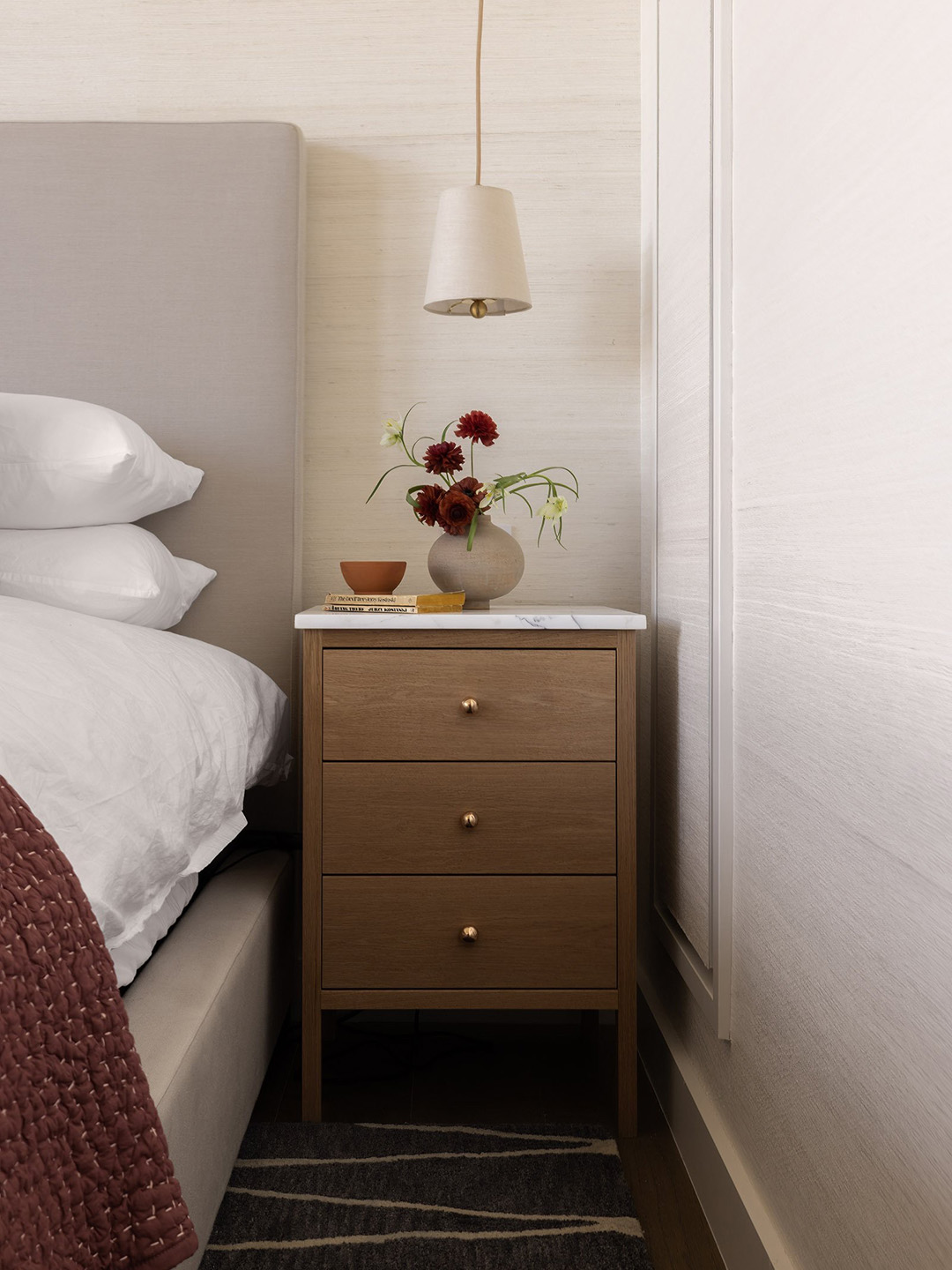 When the owner of this penthouse told White Arrow she wanted her bed to face her windows, what she was really asking them was to situate it on the narrowest wall of the room—a tricky placement that didn’t leave much space for nightstands. So the team was forced to devise bespoke side tables that fit the space’s constraints. They wanted the petite wood table to still feel grand, so they hit up the stone yard for a scrap of Arabescato. “I think having a marble top on a piece of furniture is an easy way of making something seem extra-chic,” says Keren.