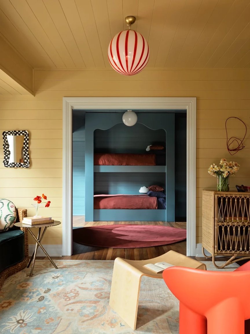 Simon suggests replacing boob lamps with statement fixtures you actually like (he loves the fringed ones by Llot Llov), keeping in mind that they can offer a chance to show off a cool ceiling or architecture. Dabito, also on Team Overhead Lighting, says: “I always think of a chandelier as an earring for your room.”