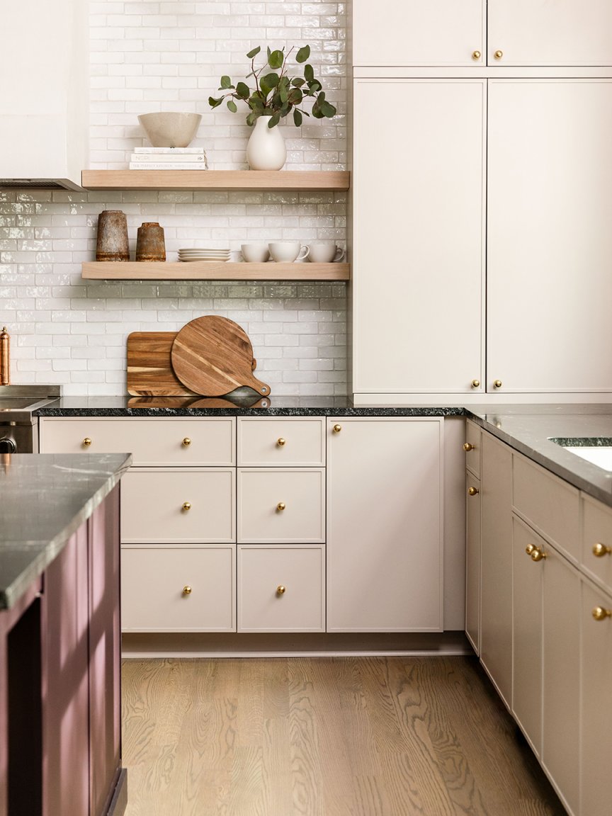 Feldman knew she wanted to play off the marbly green and blue glass but didn’t want the space to be too splashy (and therefore overwhelming). Her solution? Swap out all of the white for a “new neutral.” It’s the nuanced tone that adds interest, she says. The kitchen’s custom cabinetry, from the designer’s collaboration with Unique Kitchens & Baths, is painted a warm gray-pink (Farrow & Ball’s Elephant’s Breath), which became the anchor of the room. Its impact is felt in the “quiet details” like the Lily line’s modern take on classic Shaker cupboards (the frames are slightly thinner than usual) and understated hardware (more on that later).