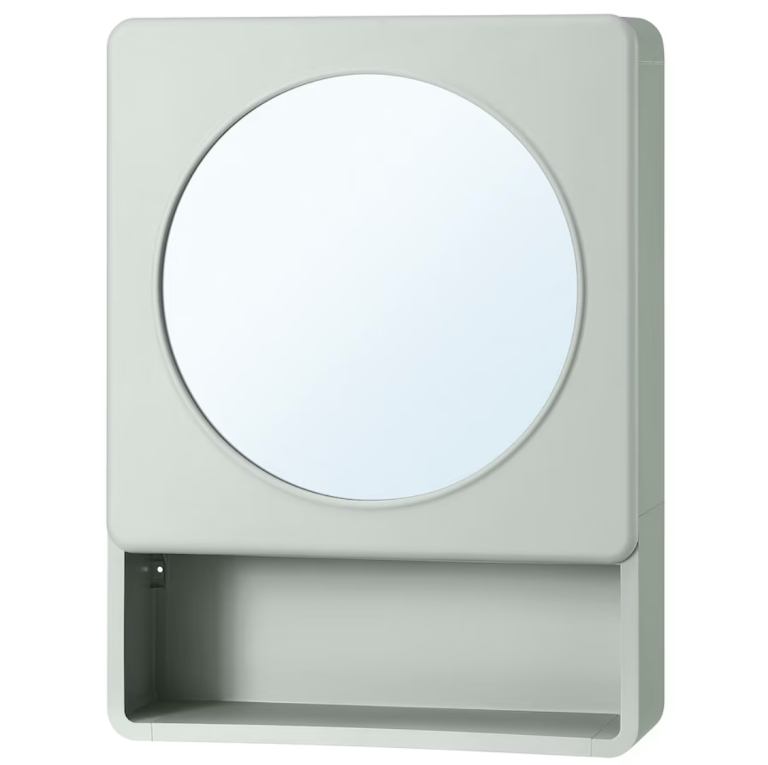 Like its cabinet counterpart, the product keeps the circular theme going with its large mirror and pale mint color. Its four rounded corners give it an additional sculptural touch, one slightly reminiscent of Ready to Hang’s $895 Bezel Mirror.