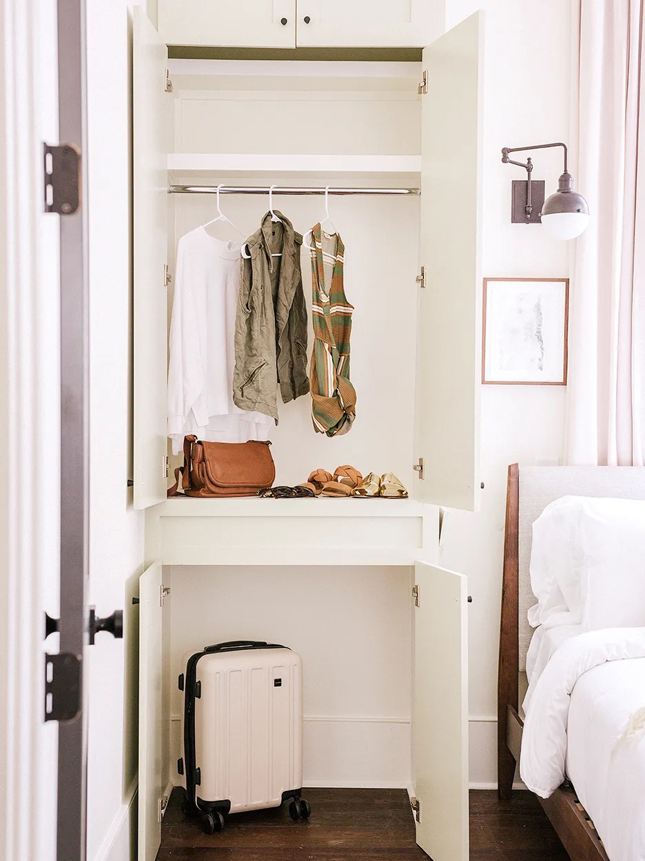 Take inspiration from the closet in this space-savvy Charleston vacation rental by putting Yamazaki Home’s new expandable suitcase rack to similar use. The product eliminates any dead space by providing much needed storage above your bags.